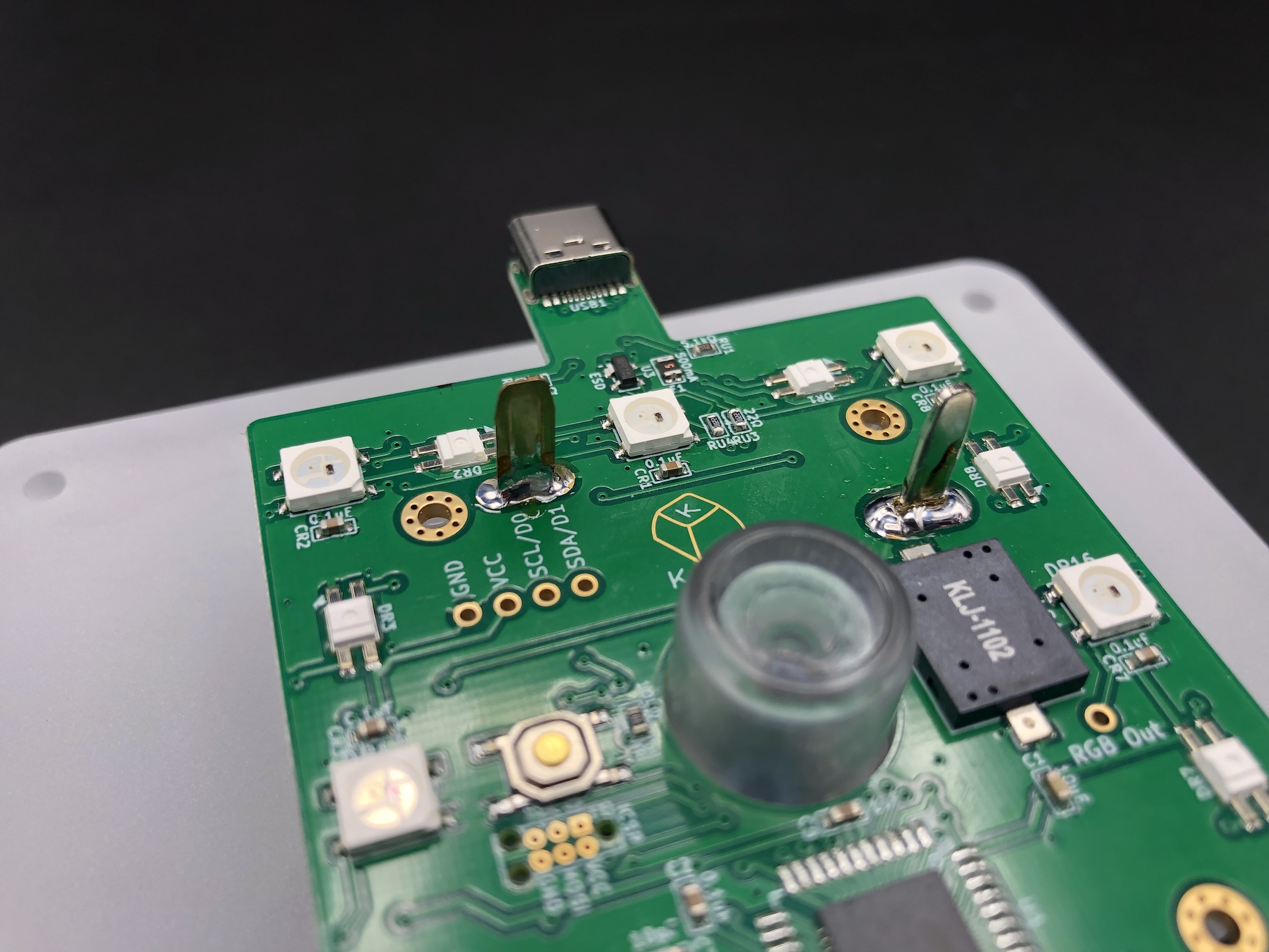 Insert the switch legs of the Big Switch through the PCB and solder them on. Make sure the solder sticks to both the switch leg and the pad on the PCB. You might need to keep your soldering iron tip at the joint for a bit longer than you would with a normal-sized switch. Also add solder to both sides of the legs.
