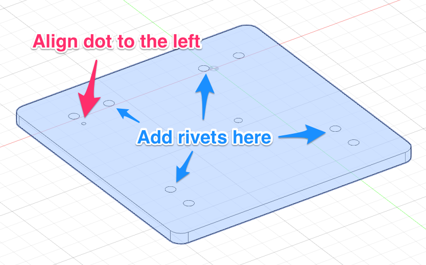Make sure the registration dot is aligned to the left. Then add rivet nuts on the underside of the plate in the spots indicated below.