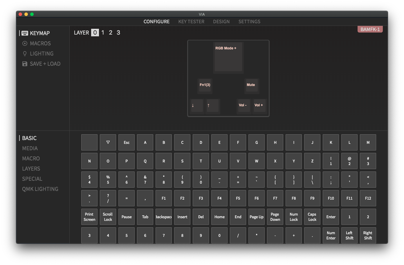 Here's the link for configuring the BAMFK-1 with QMK Configurator: https://config.qmk.fm/#/keebio/bamfk1/LAYOUT