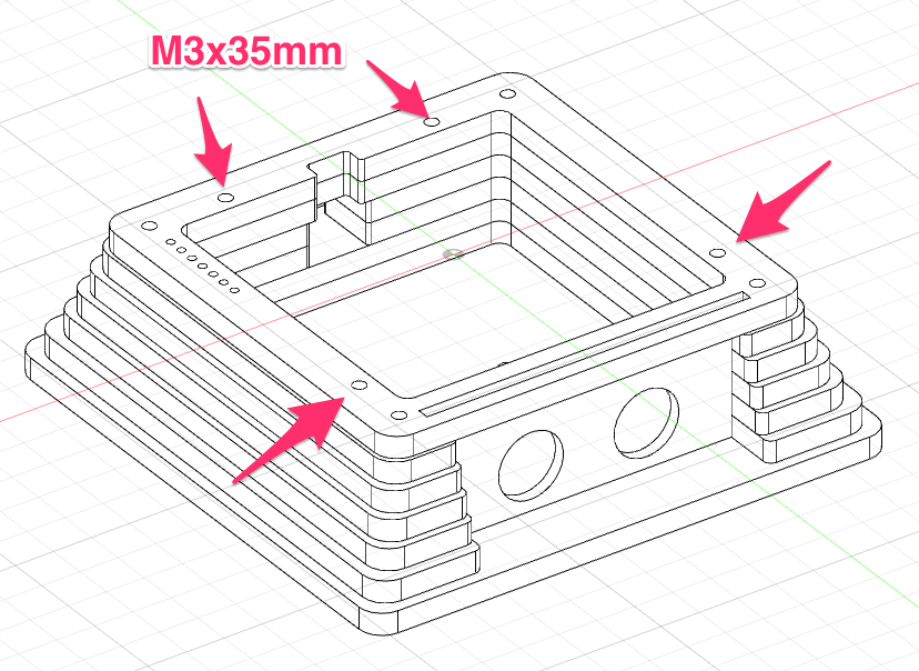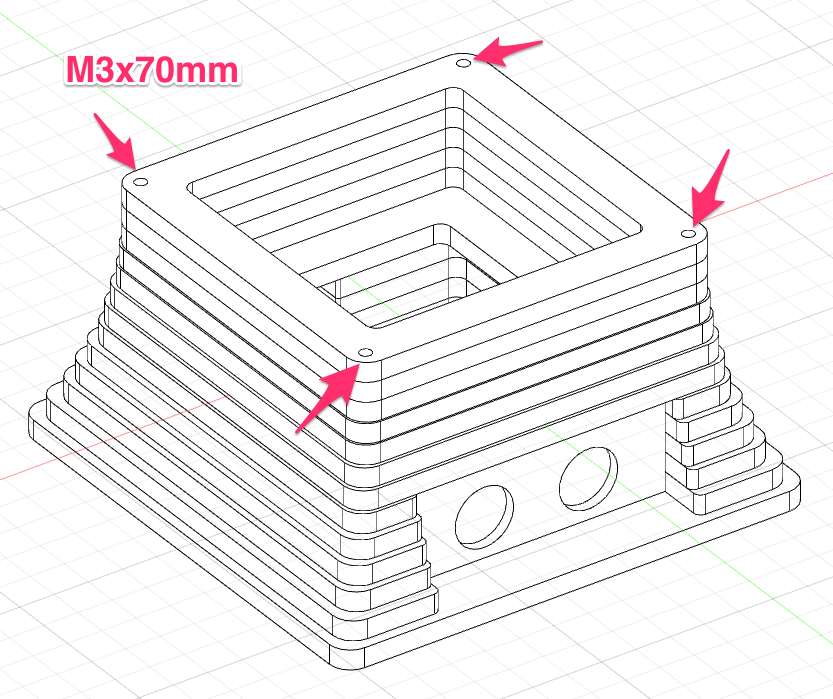 Take the 35mm M3 screws and slot them through all the pieces stacked so far and screw them into the rivet nuts.