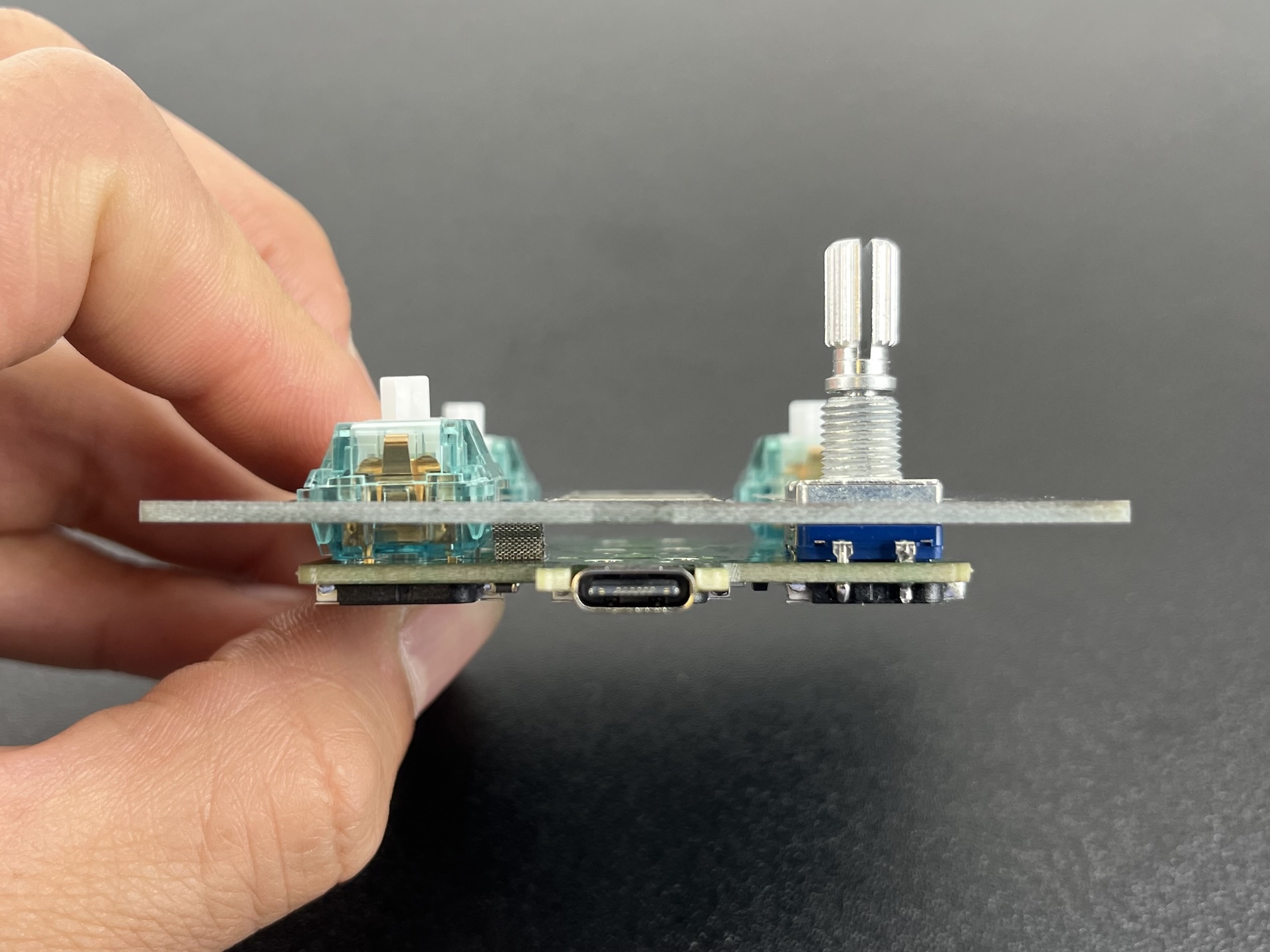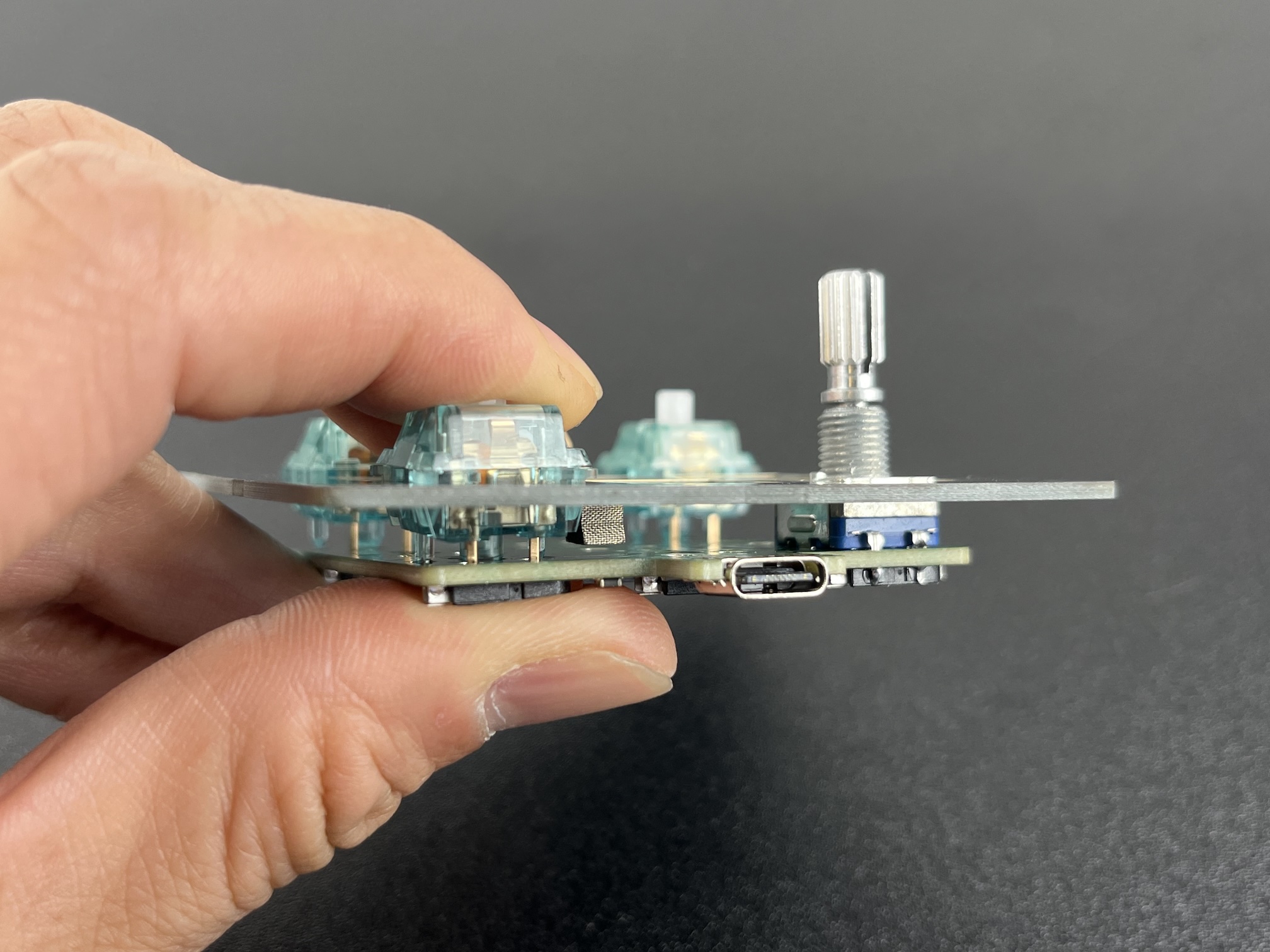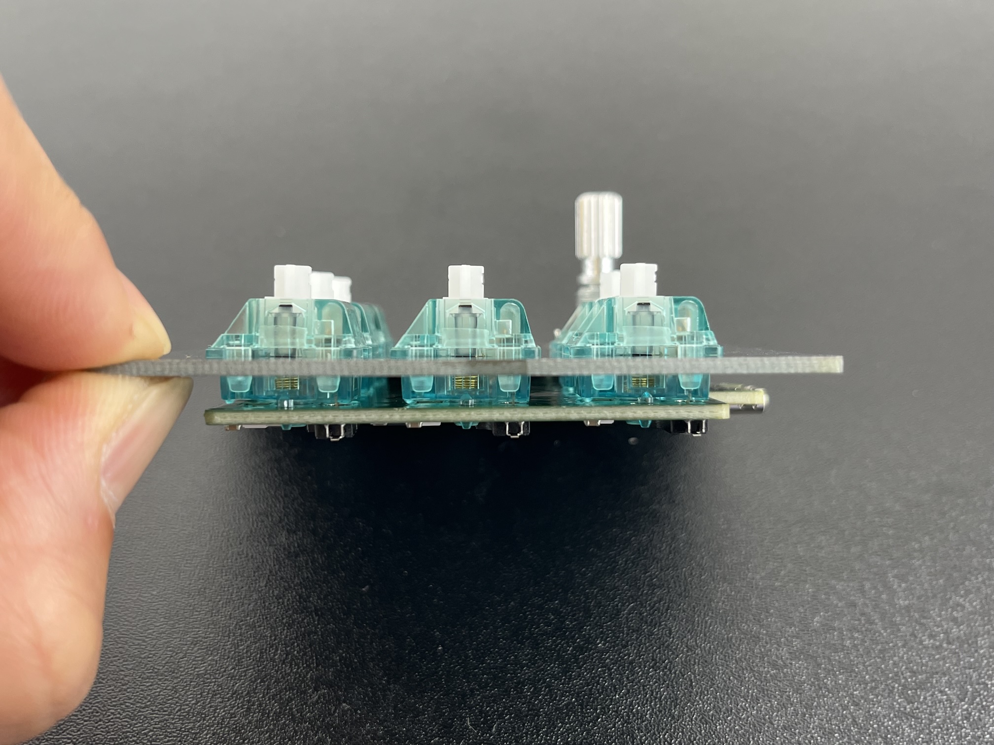 It is difficult to put in the rotary encoders into the PCB pads if the switch plate and switches are already on, so make sure you add the encoders first.