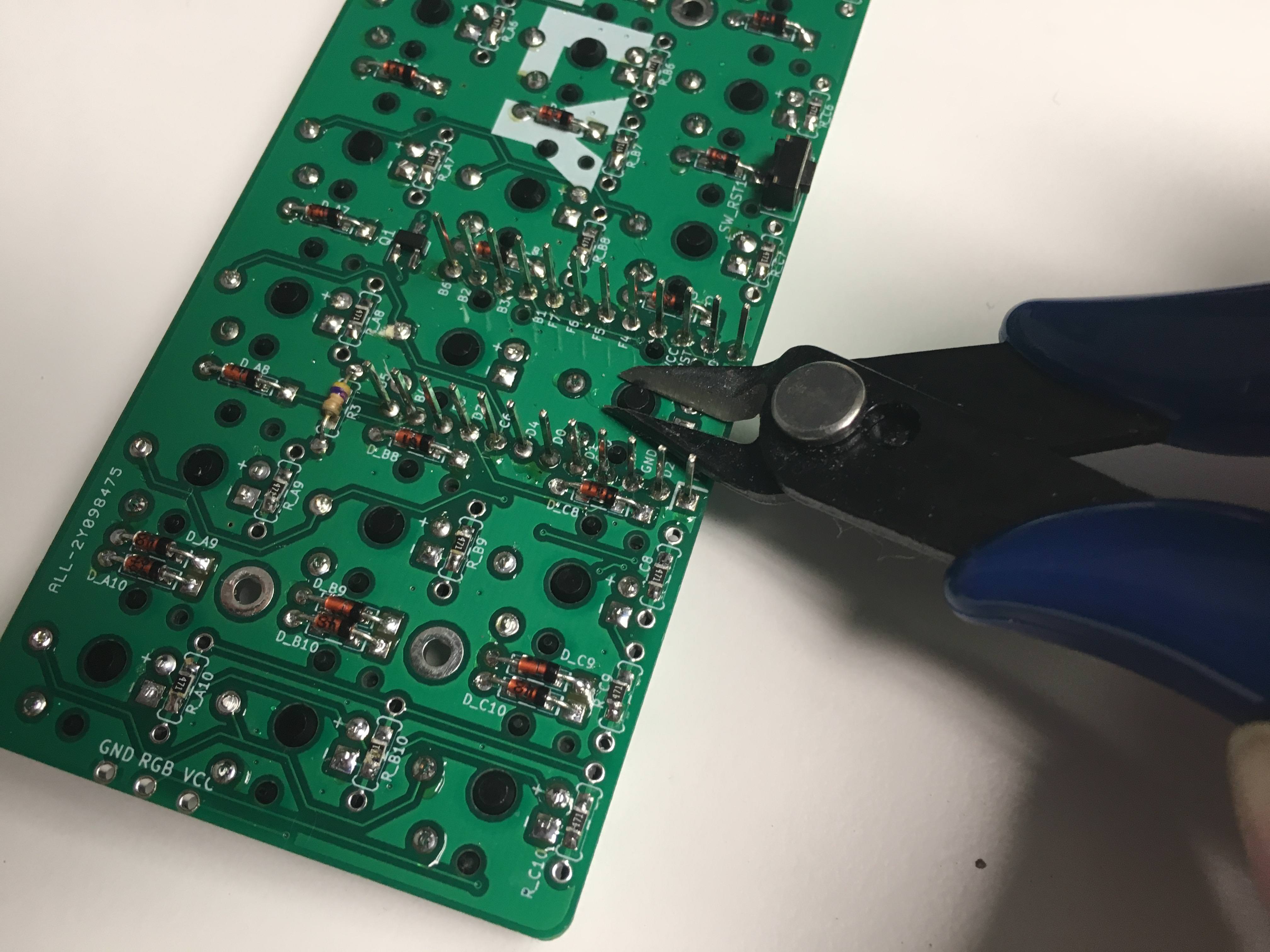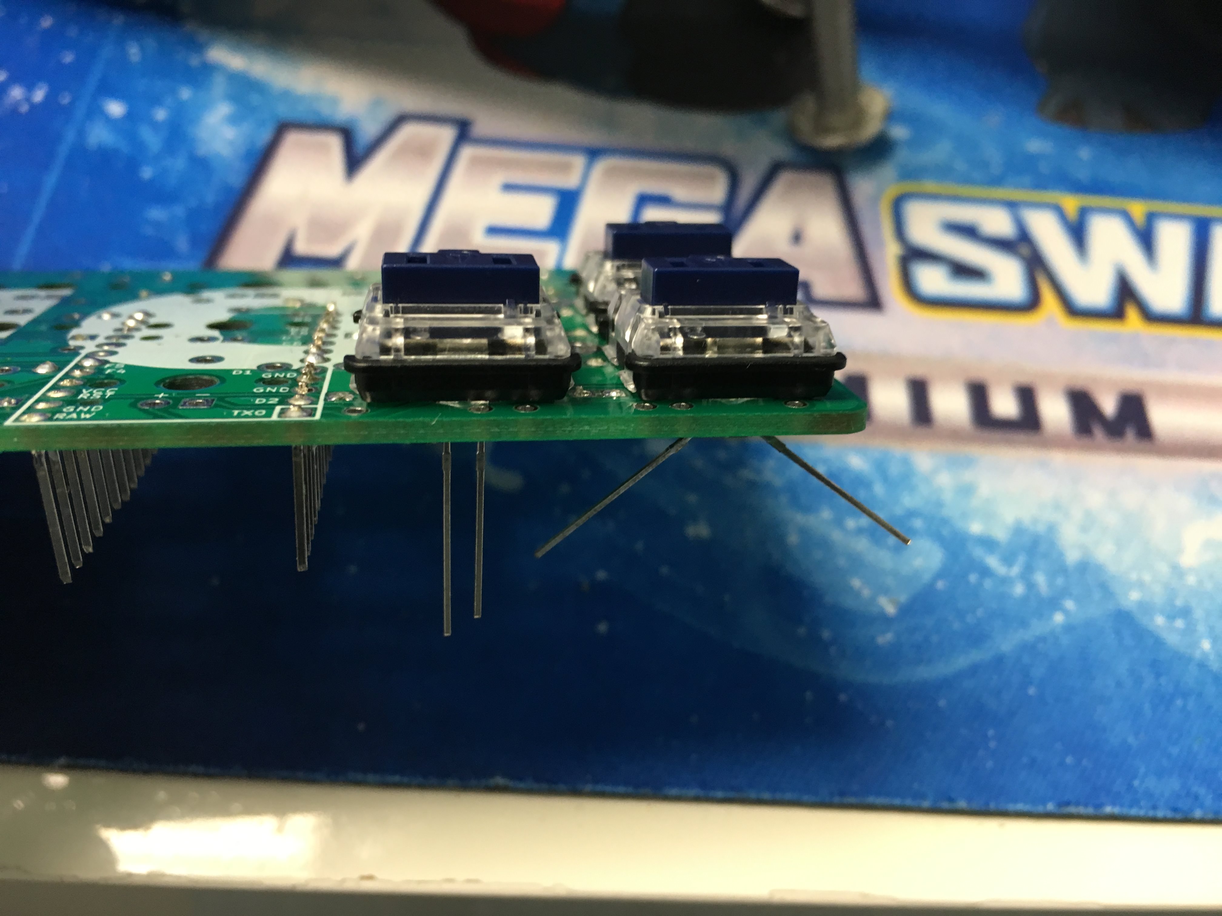 After soldering the LEDs and switches, use some flush cutters to clip the switch legs and plastic pieces of the 2 switches that sit on top of the Pro Micro, so they don't interfere with the Pro Micro: