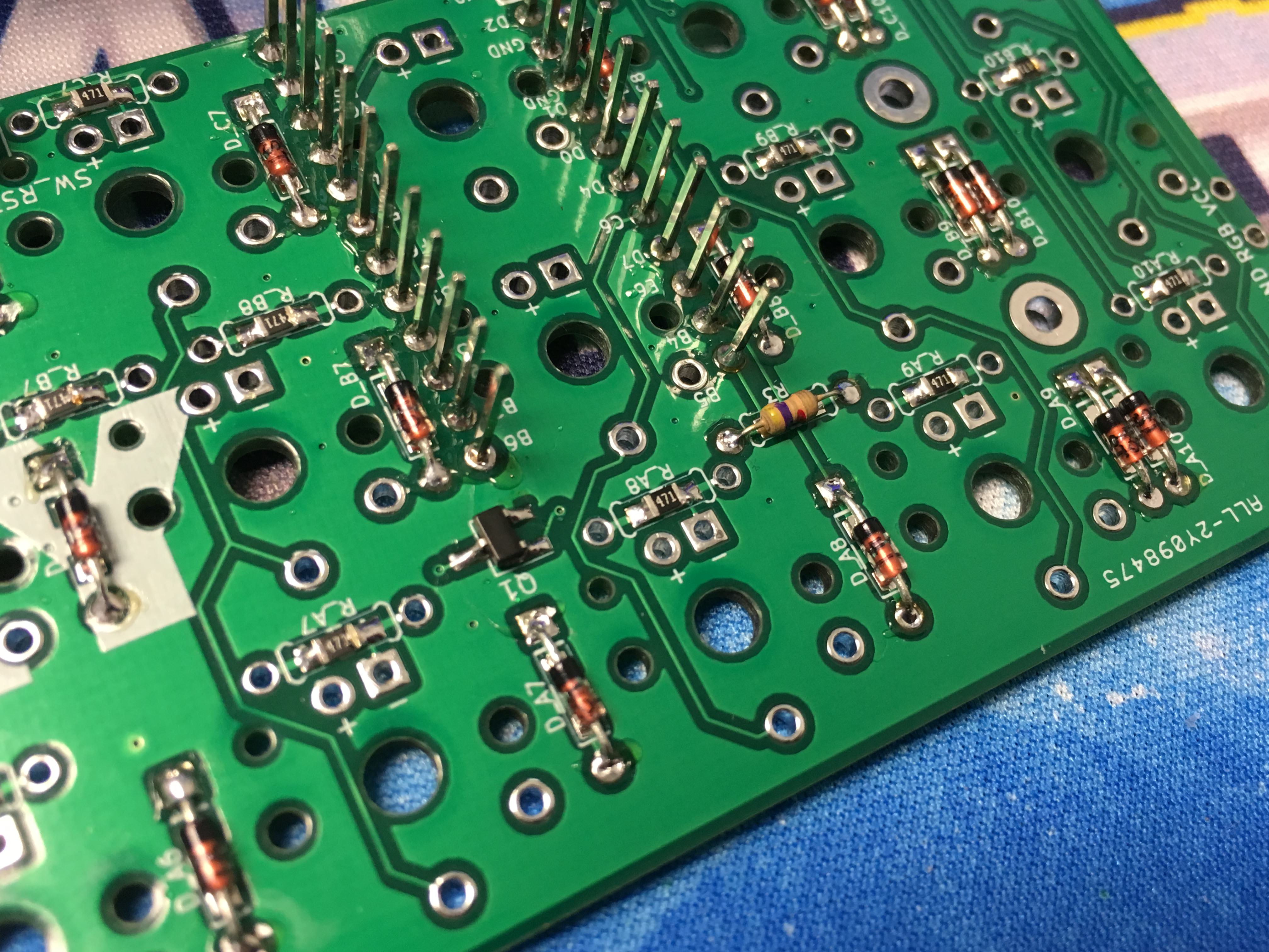 Add a bit of solder to one leg of the MOSFET pad Q1. Solder one leg of the MOSFET first and once that is aligned, solder the other two legs. Also add 470 Ohm resistors to all the resistor slots (all horizontally oriented):