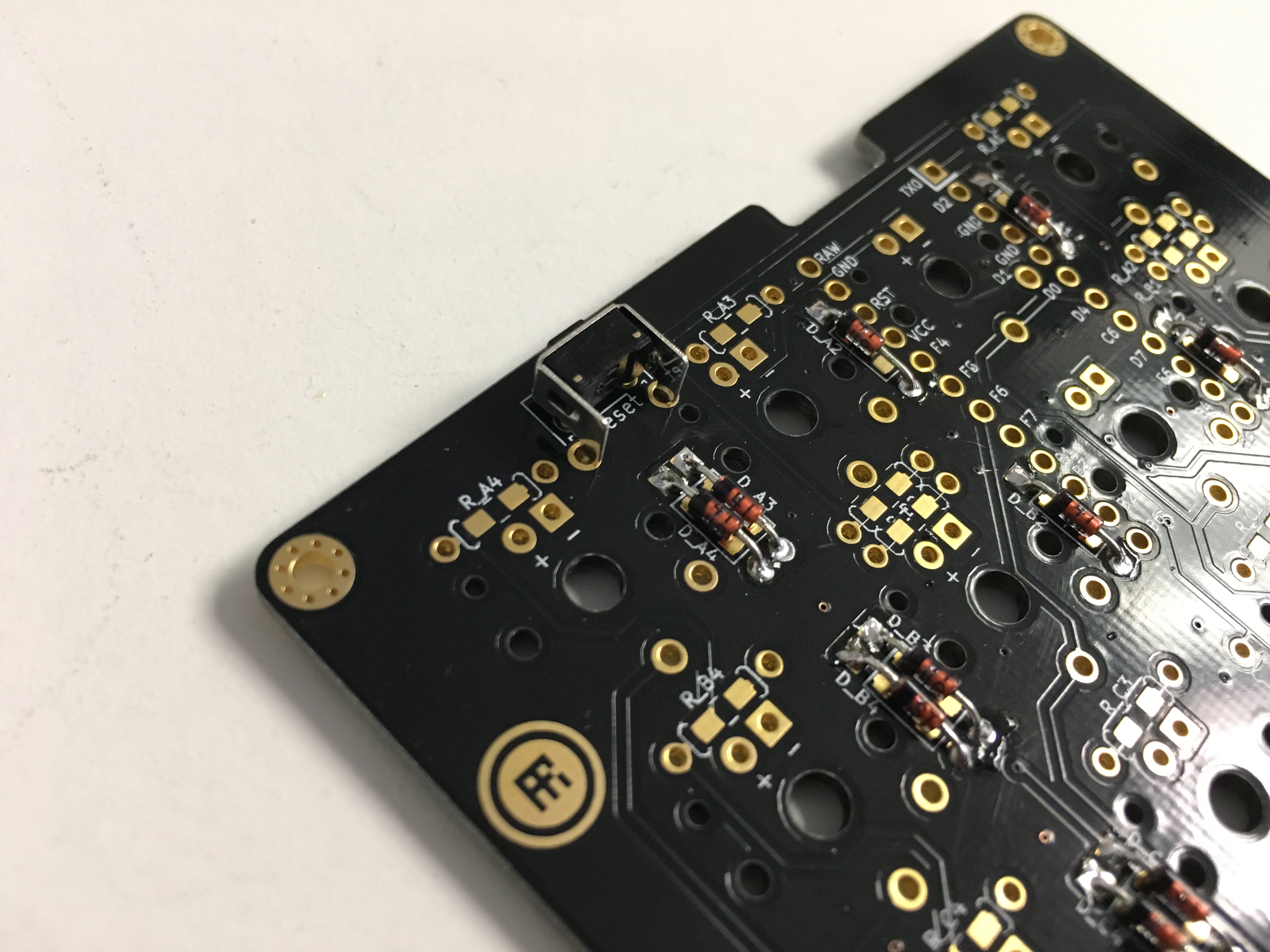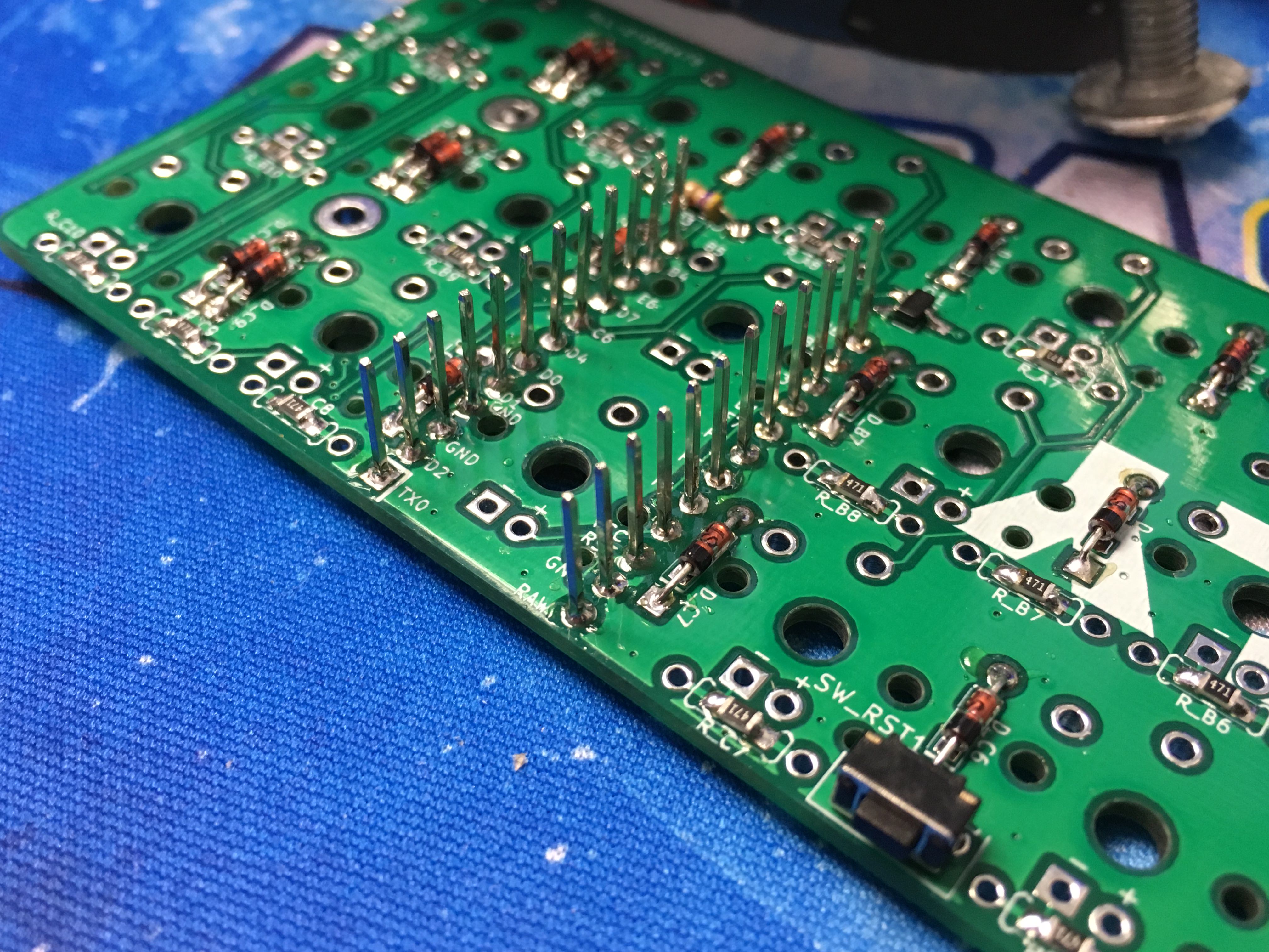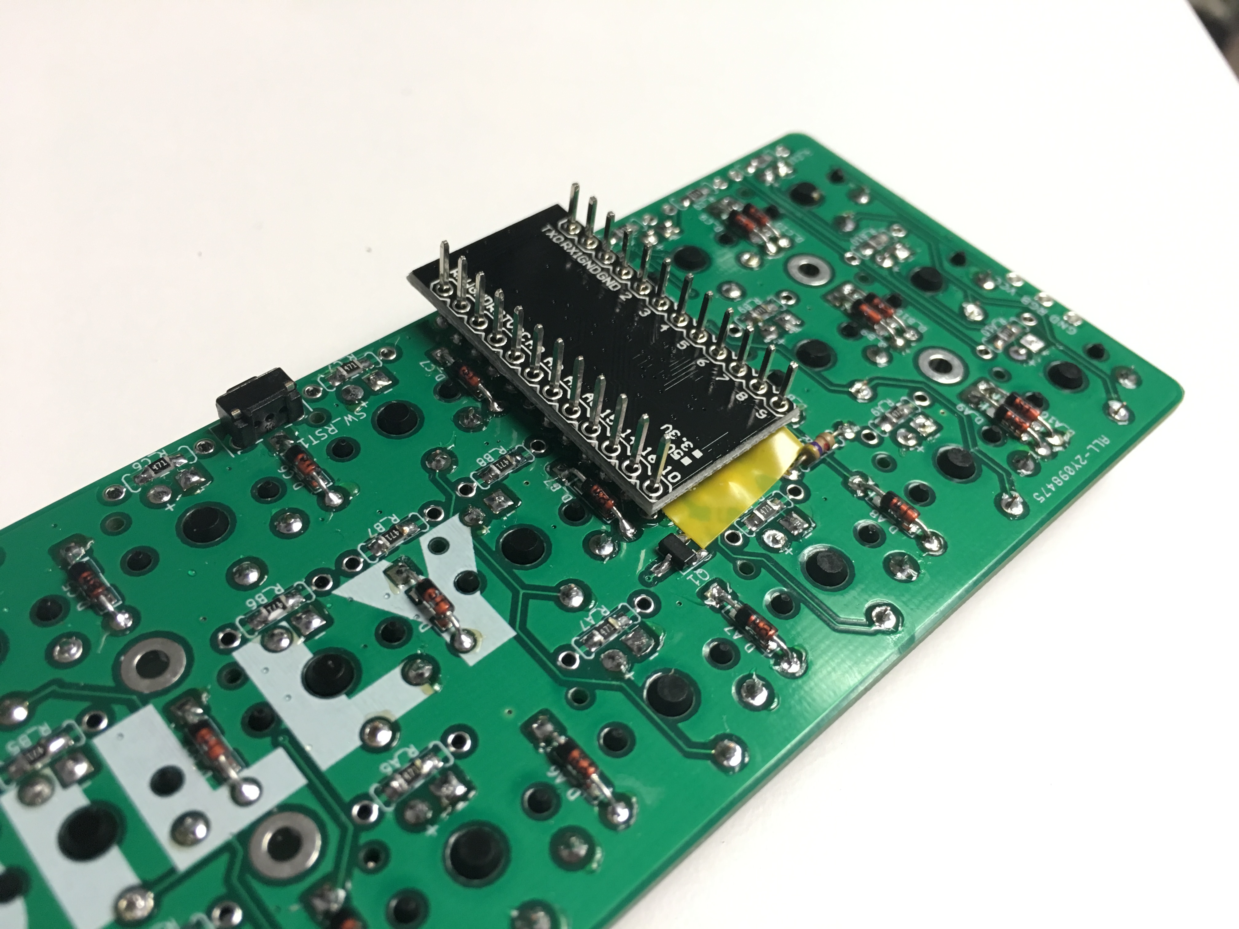 Insert Pro Micro over the header pins and solder. But only do this after you've flashed your Pro Micro to ensure that it works: