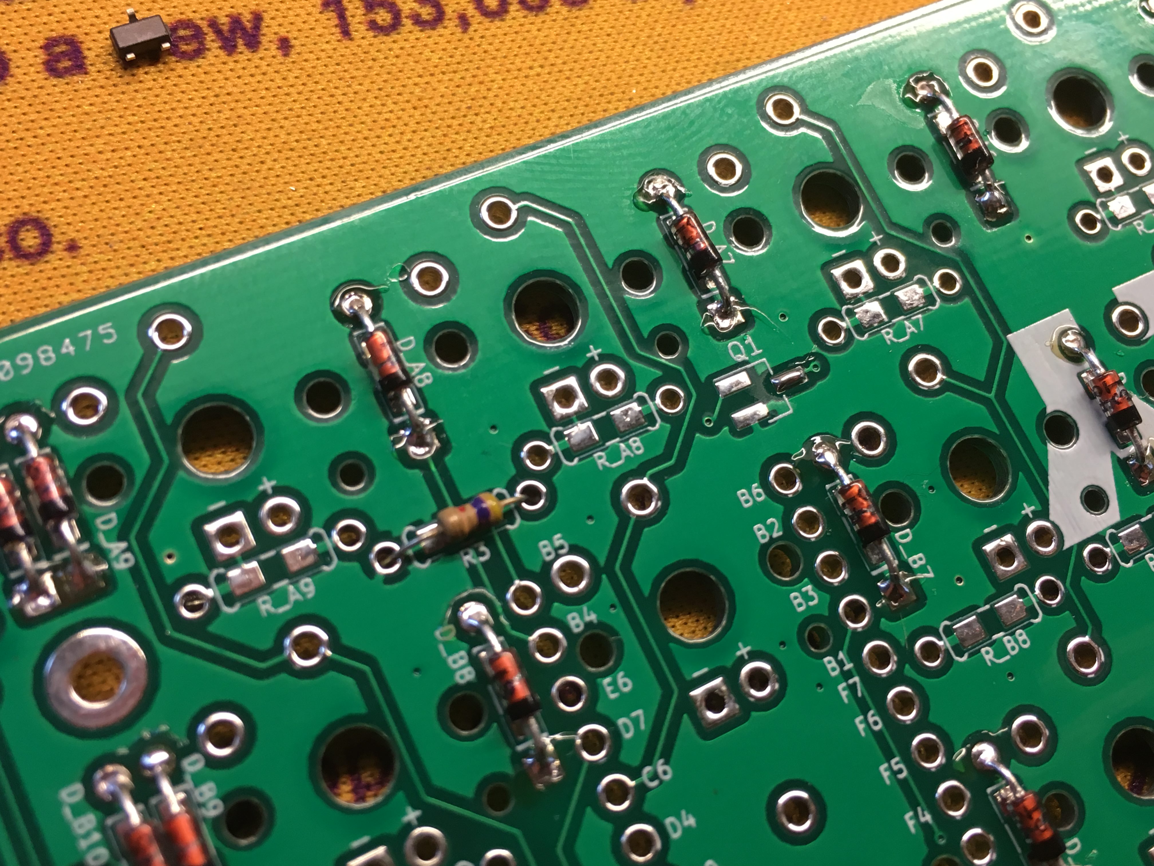 If you're doing LEDs, add the resistors. SMD reistors shown here, but it's cool if you feel like going with through hole ones. Orientation does not matter for resistors: