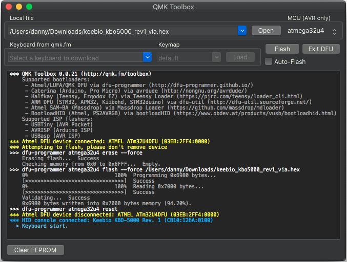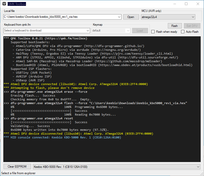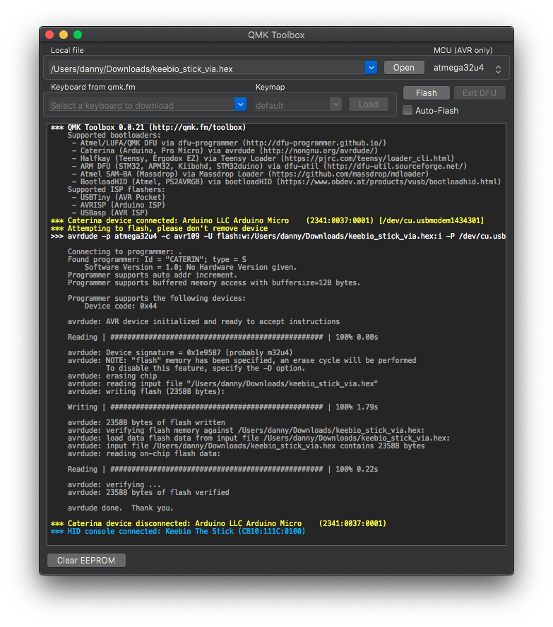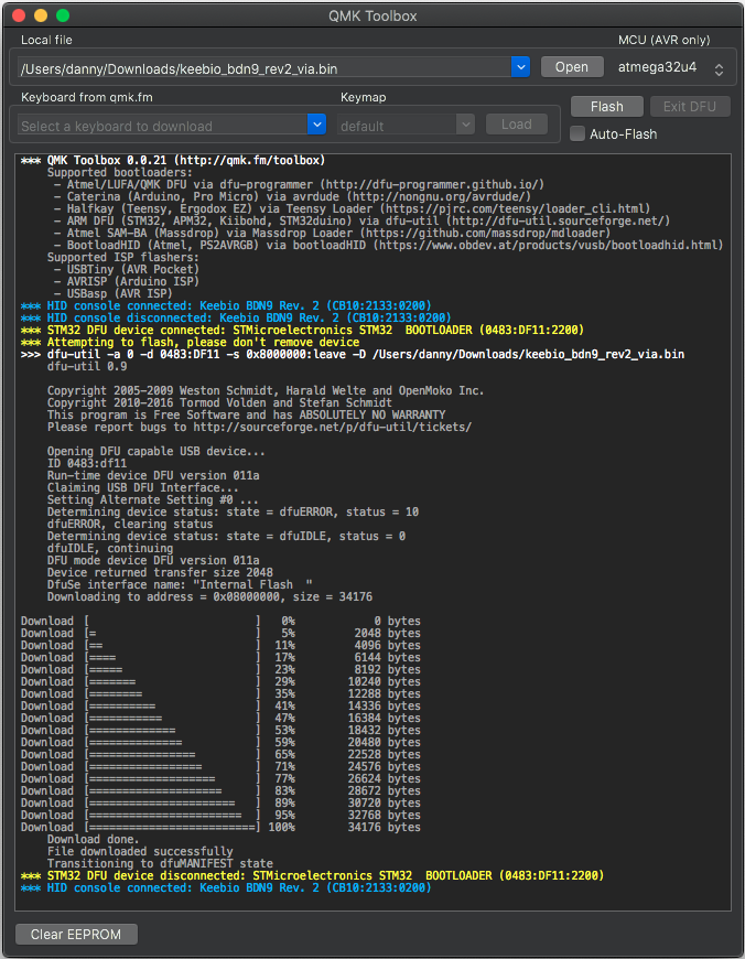 - You'll know it's finished and functioning keyboard if you have seen the second yellow line indicating that the bootloader device has disconnected.
