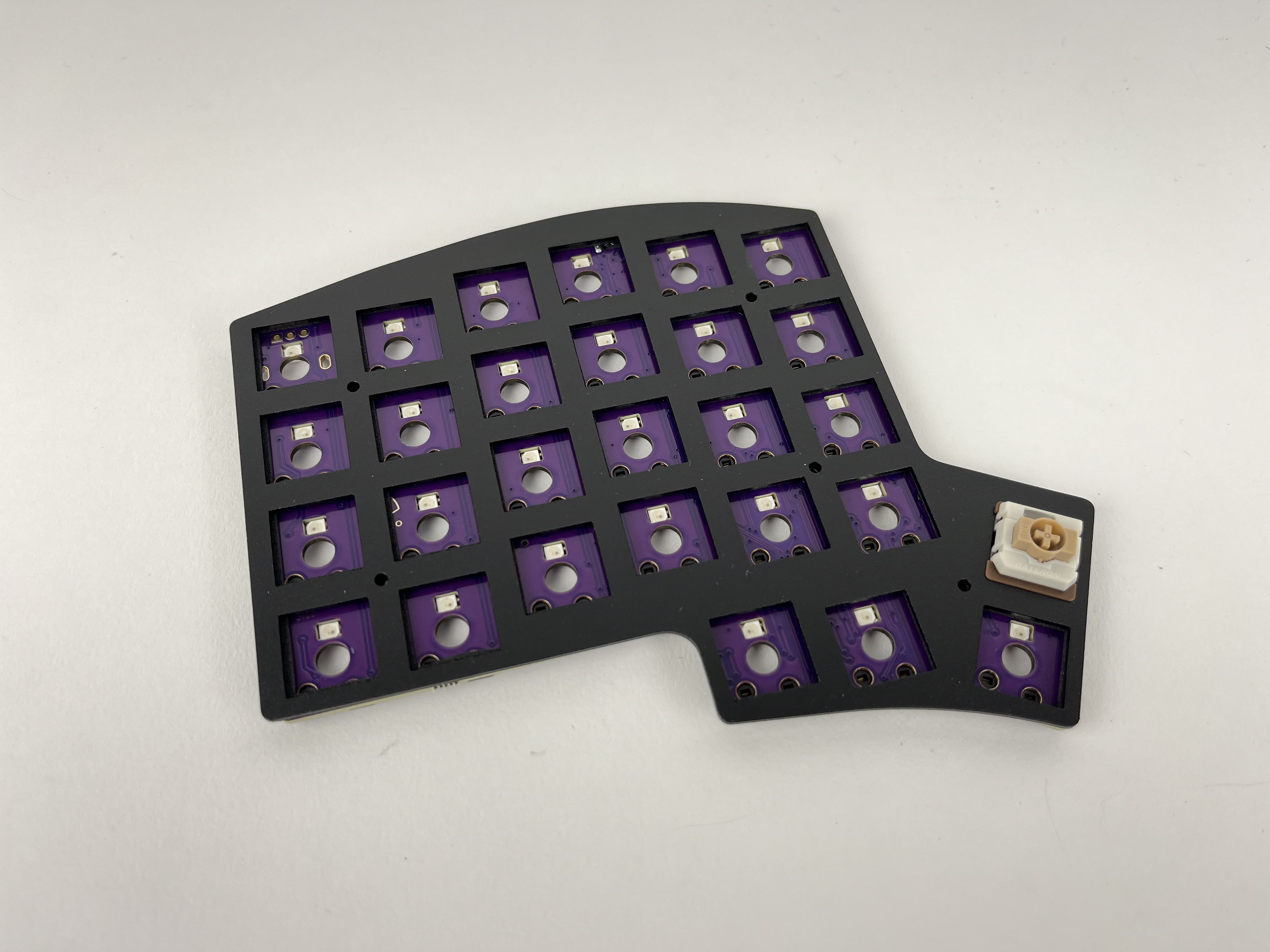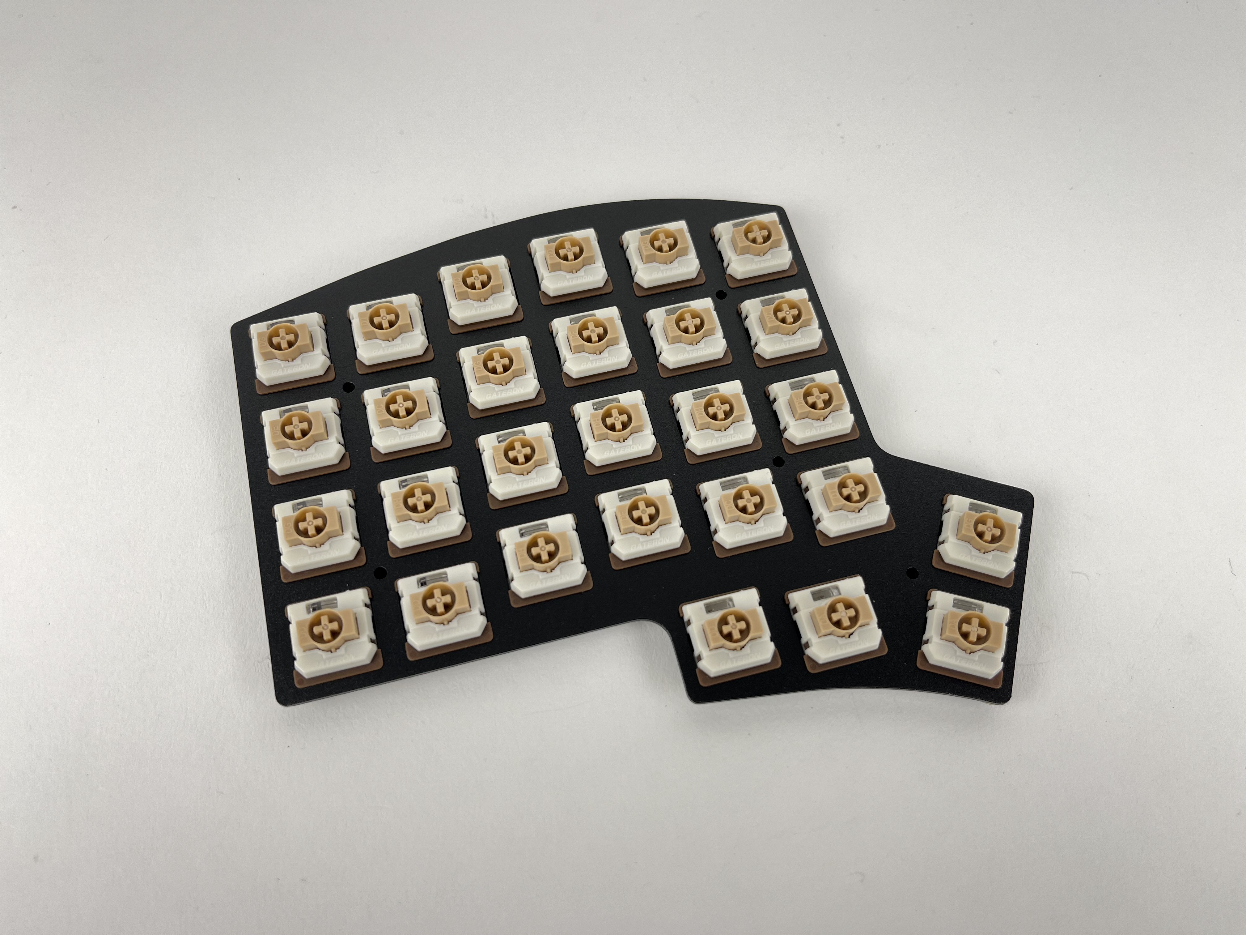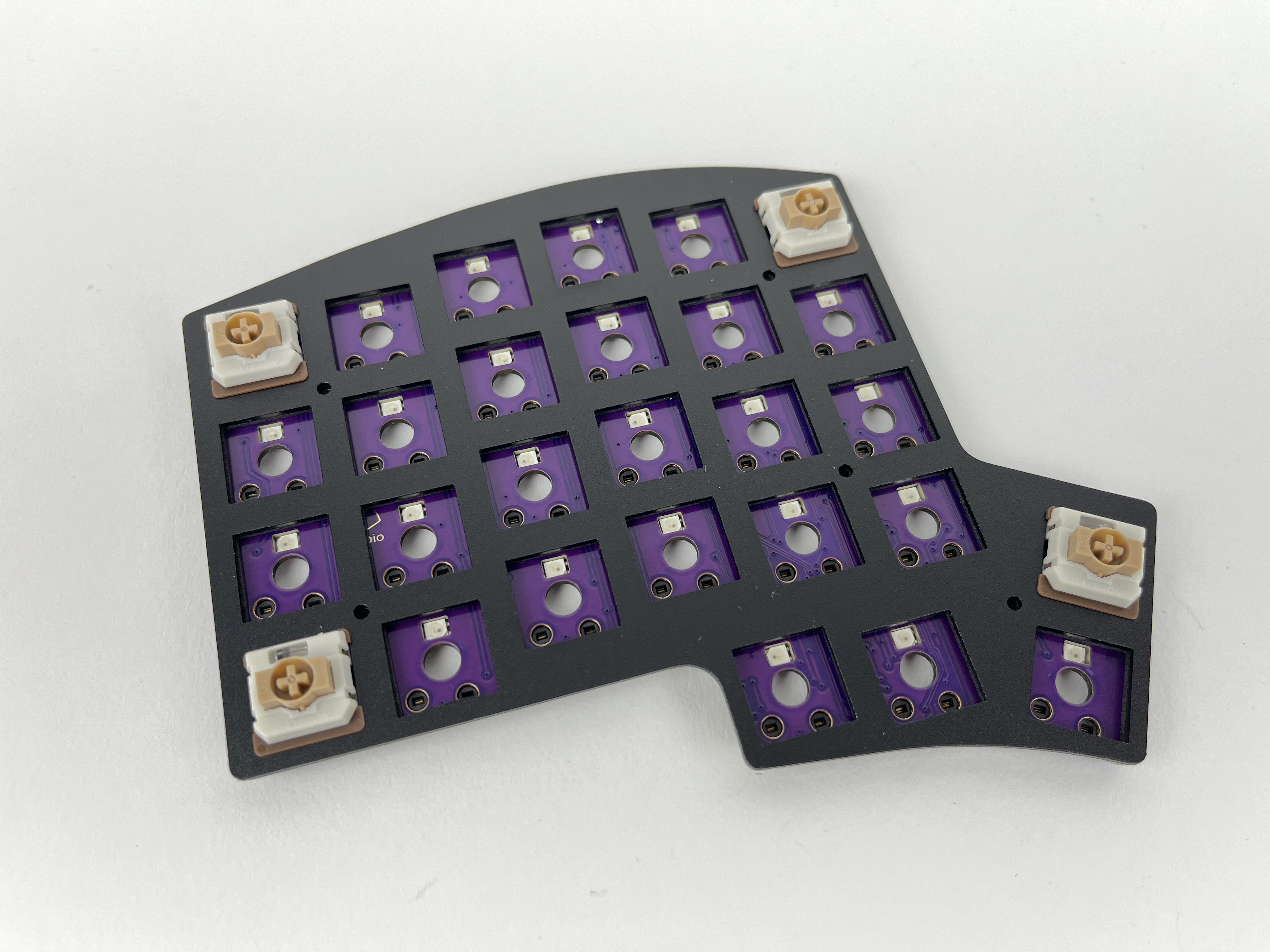 Insert some switches are the corners and check again that things are still lined up correctly. The switches should be flush with the plate. If a couple of the switches don't sit flat on the plate, remove the plate, reposition the foam piece, and try again.