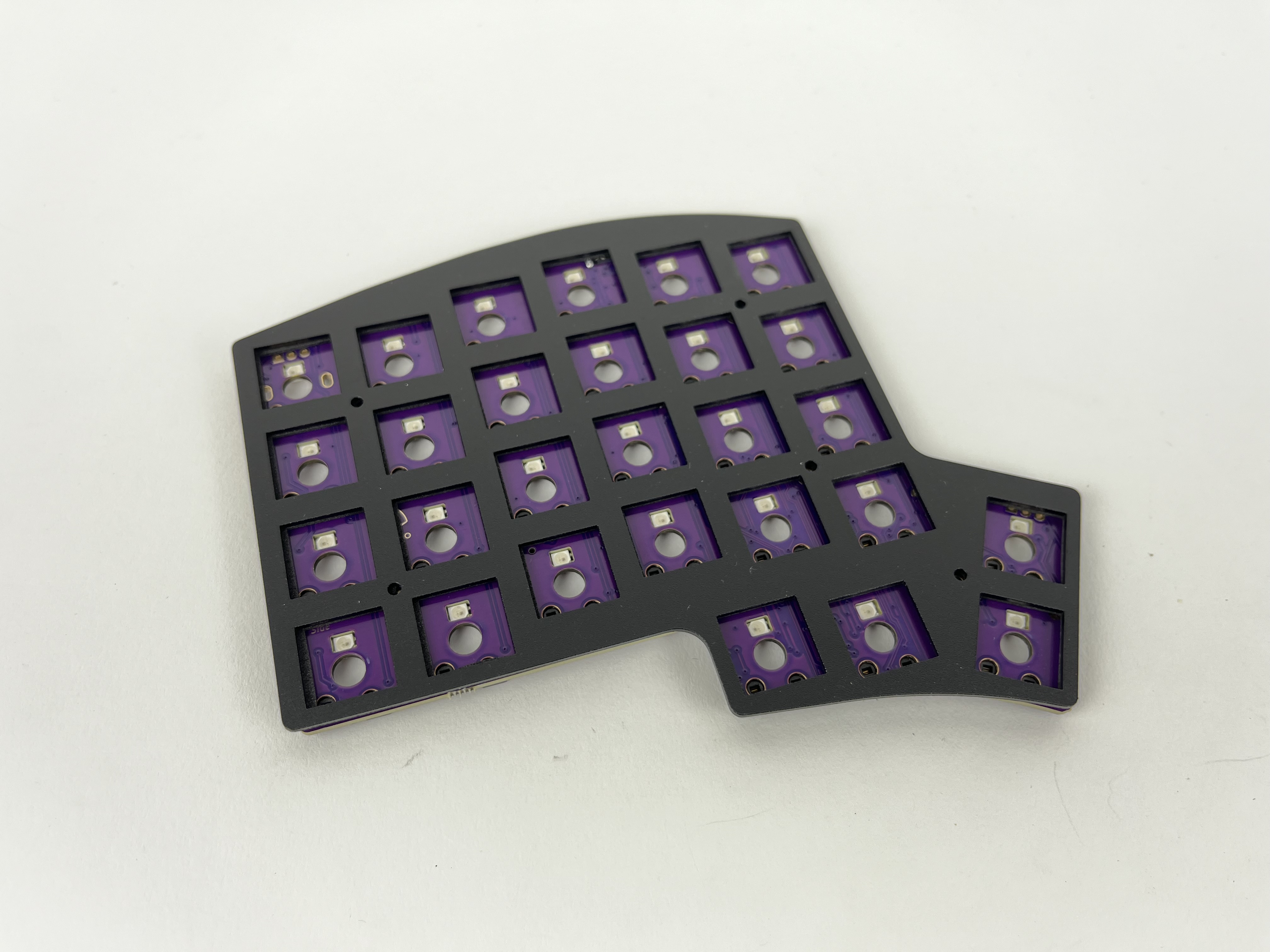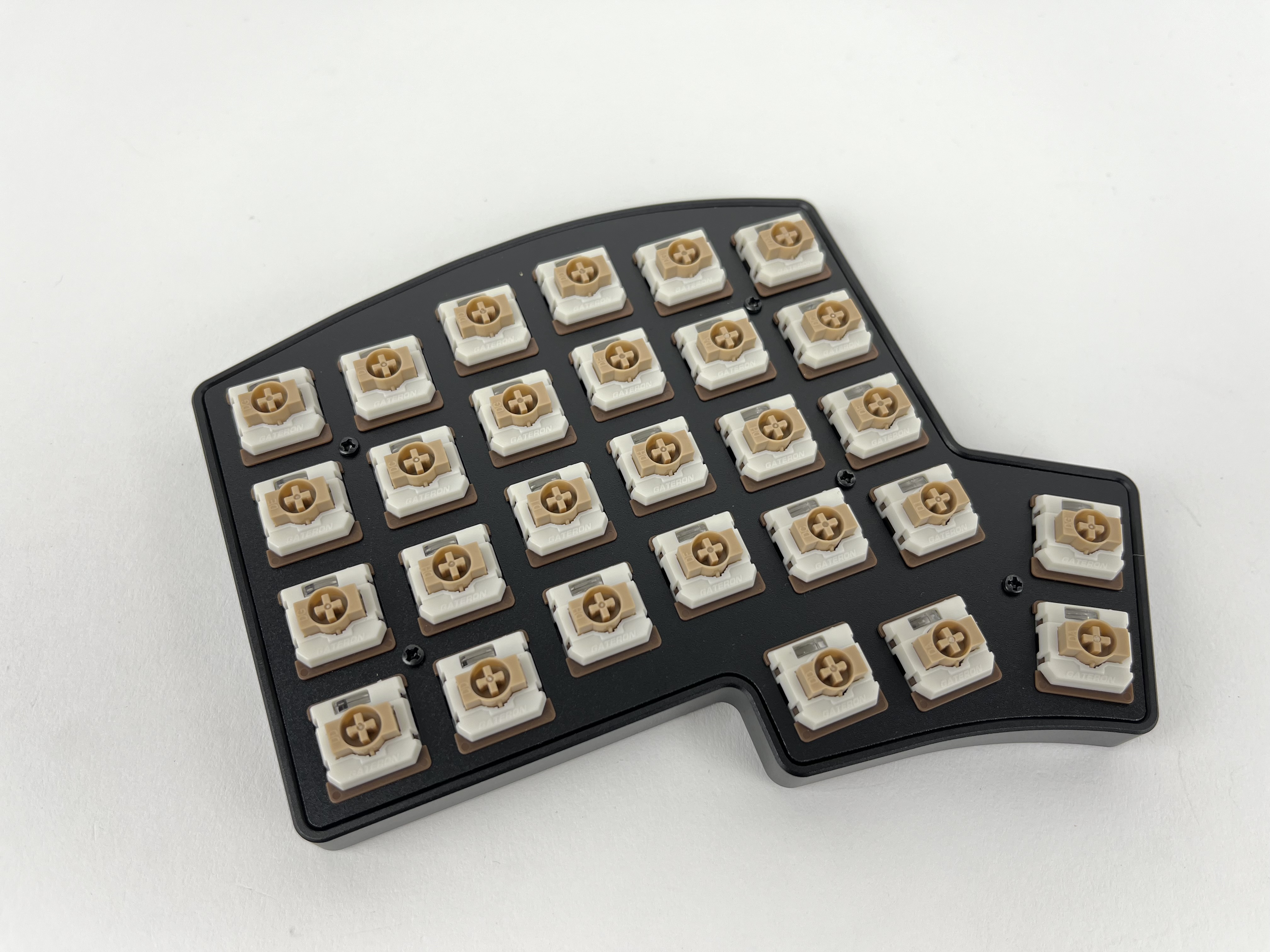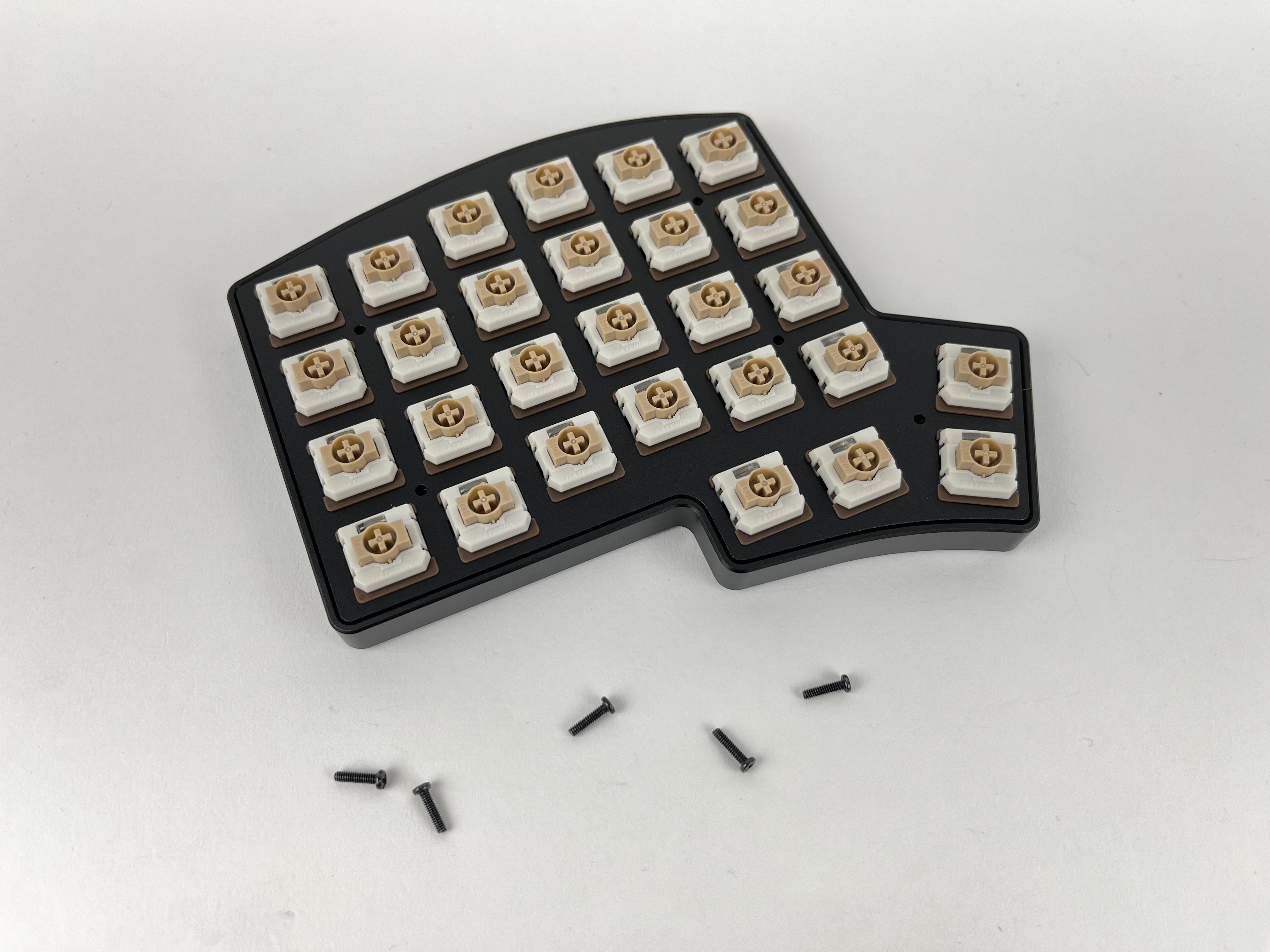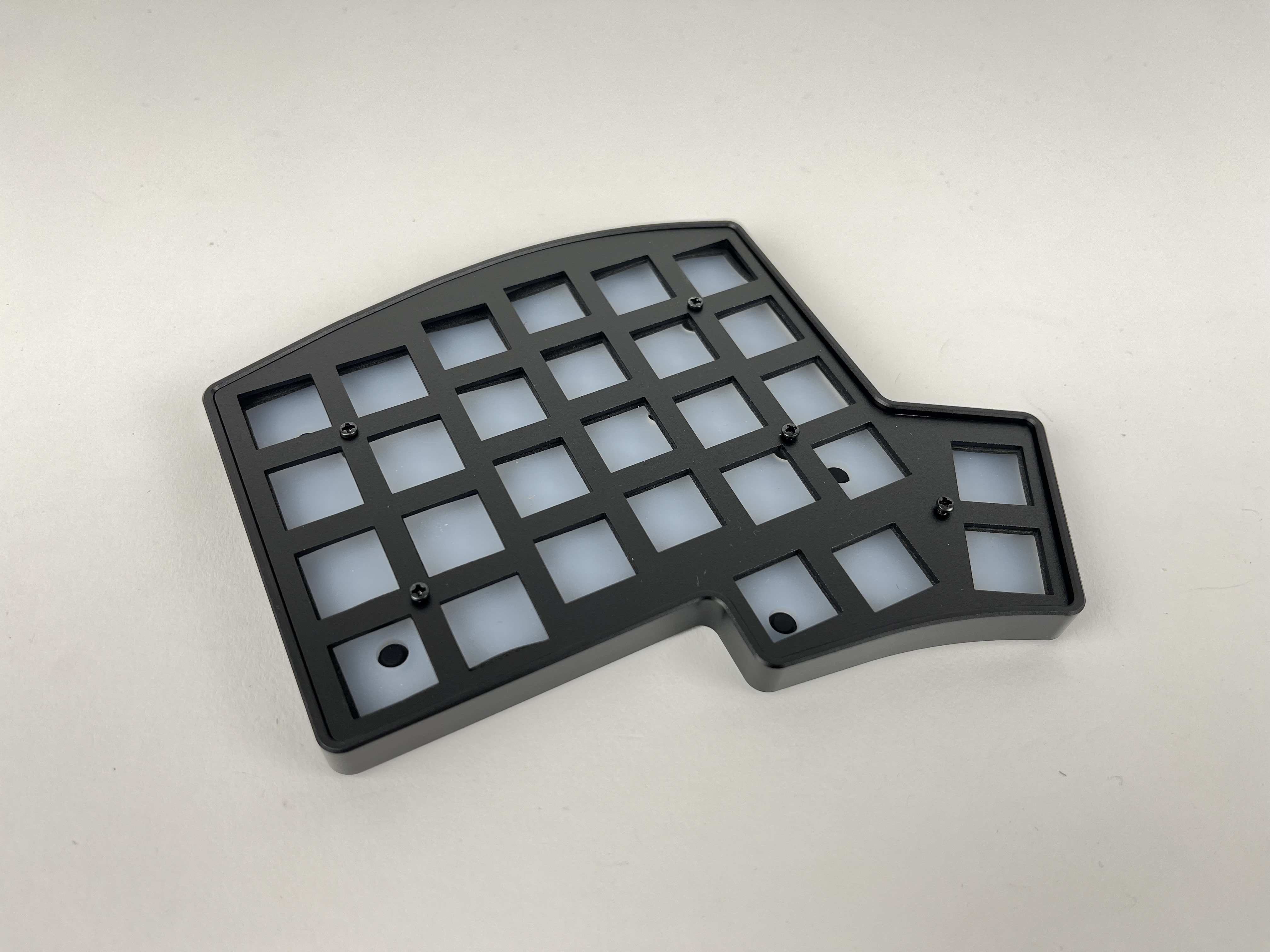 Insert some switches are the corners and check again that things are still lined up correctly. The switches should be flush with the plate. If a couple of the switches don't sit flat on the plate, remove the plate, reposition the foam piece, and try again.