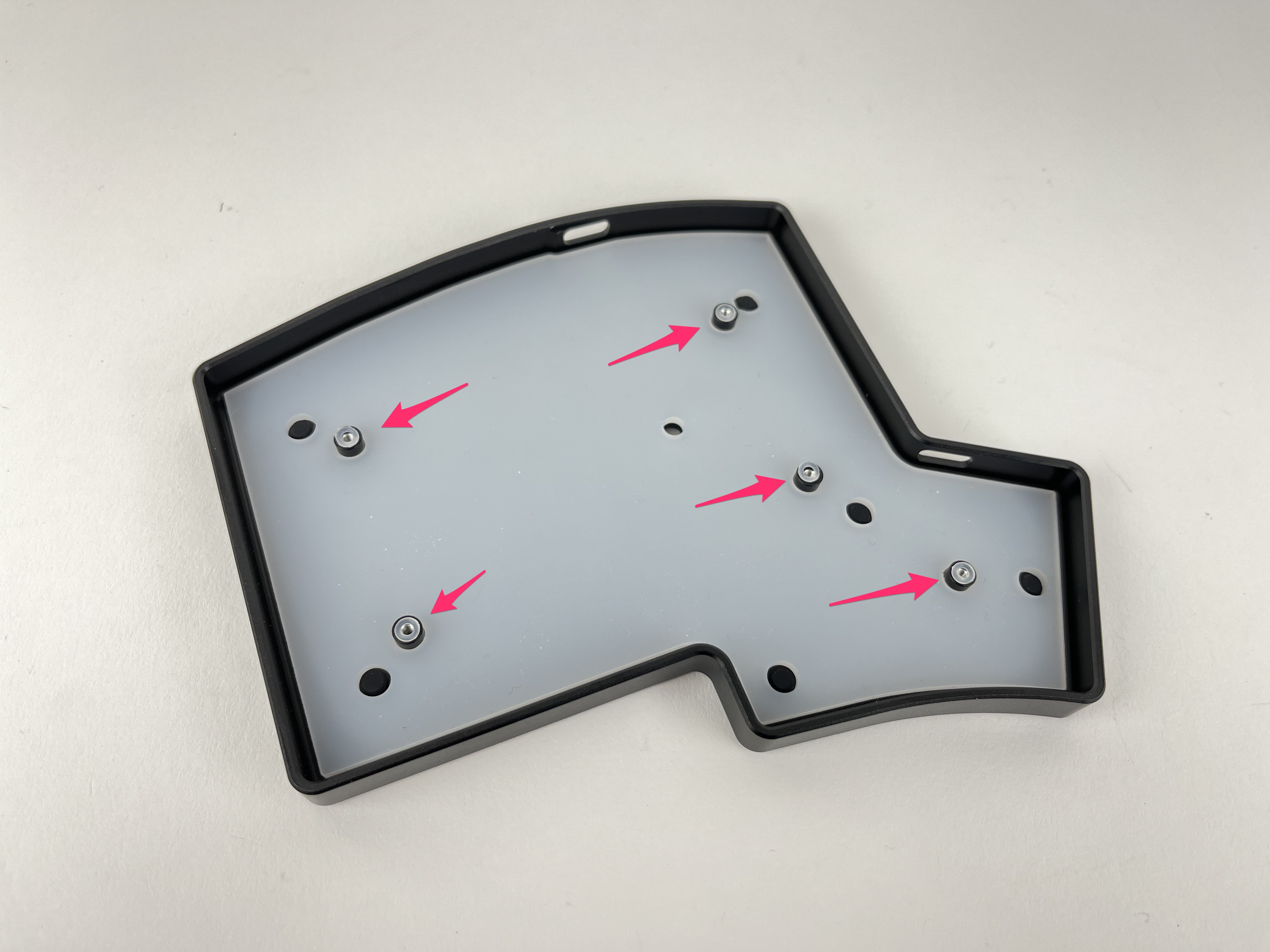 Add the switch plate on top of the foam piece, checking alignment of the screw holes again with the PCB.