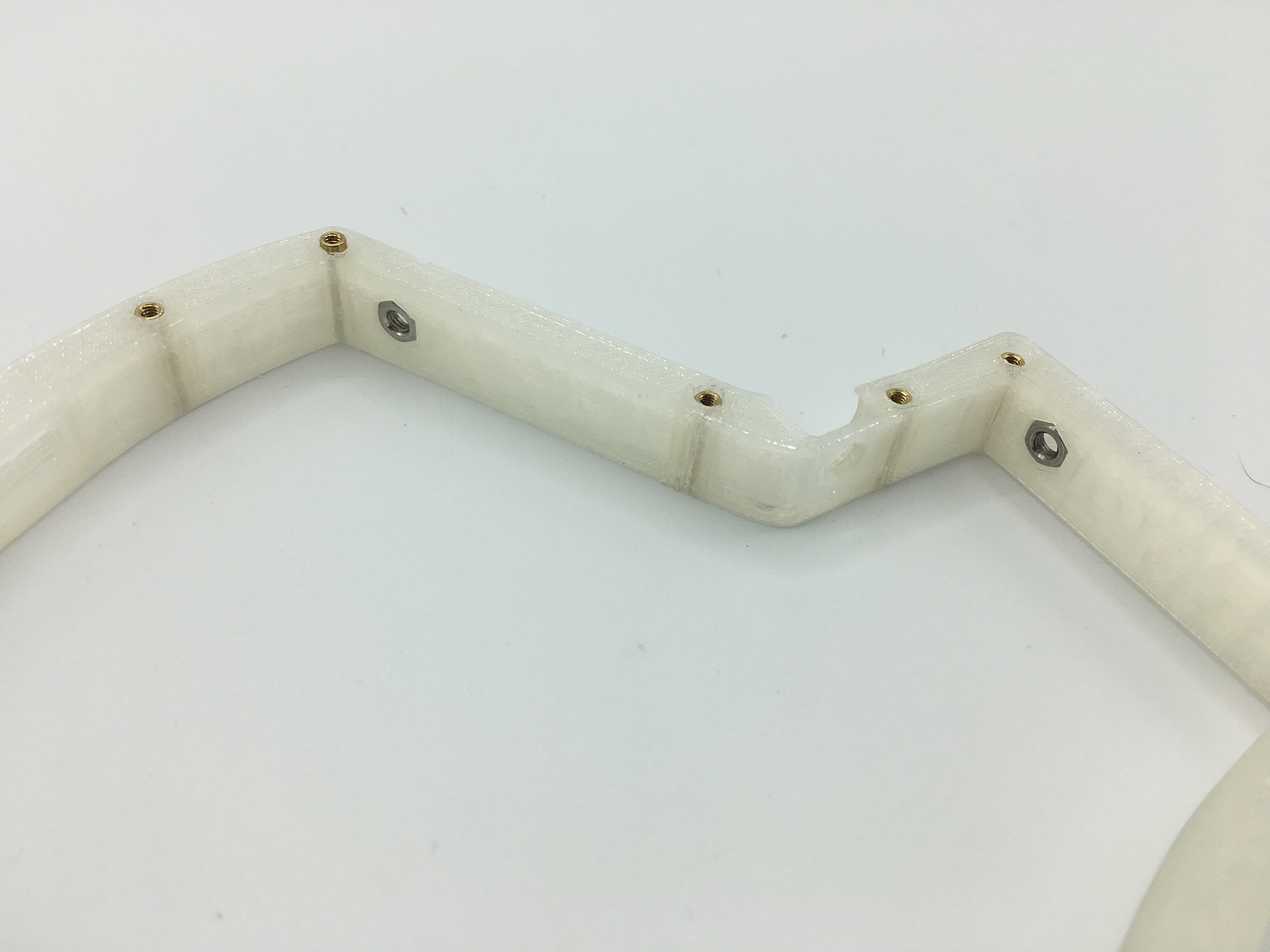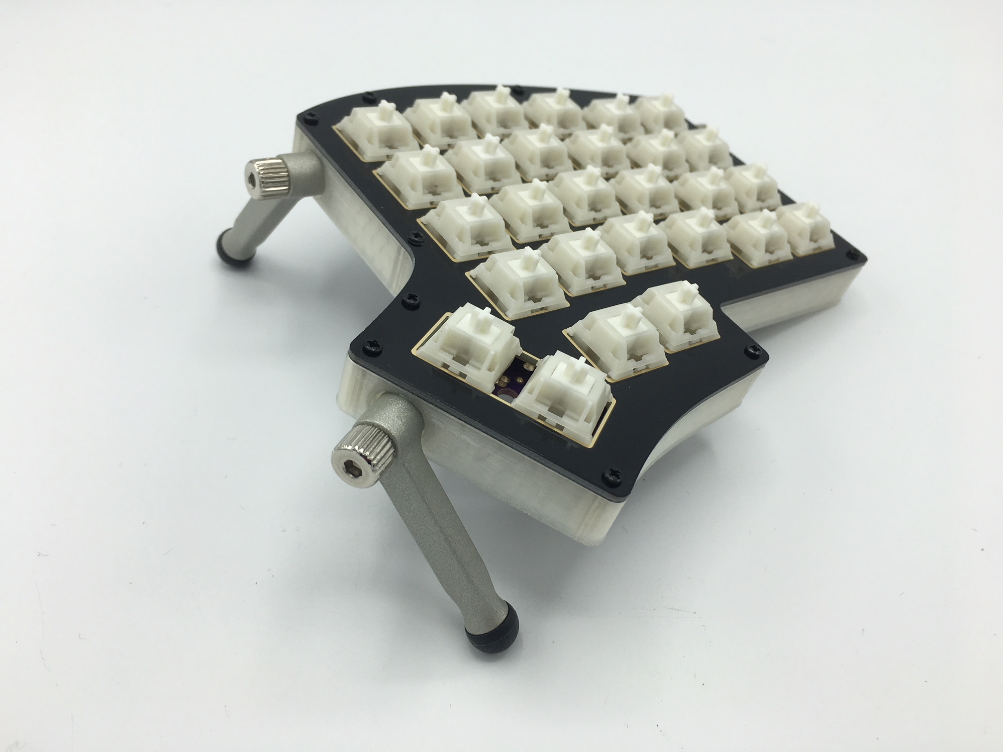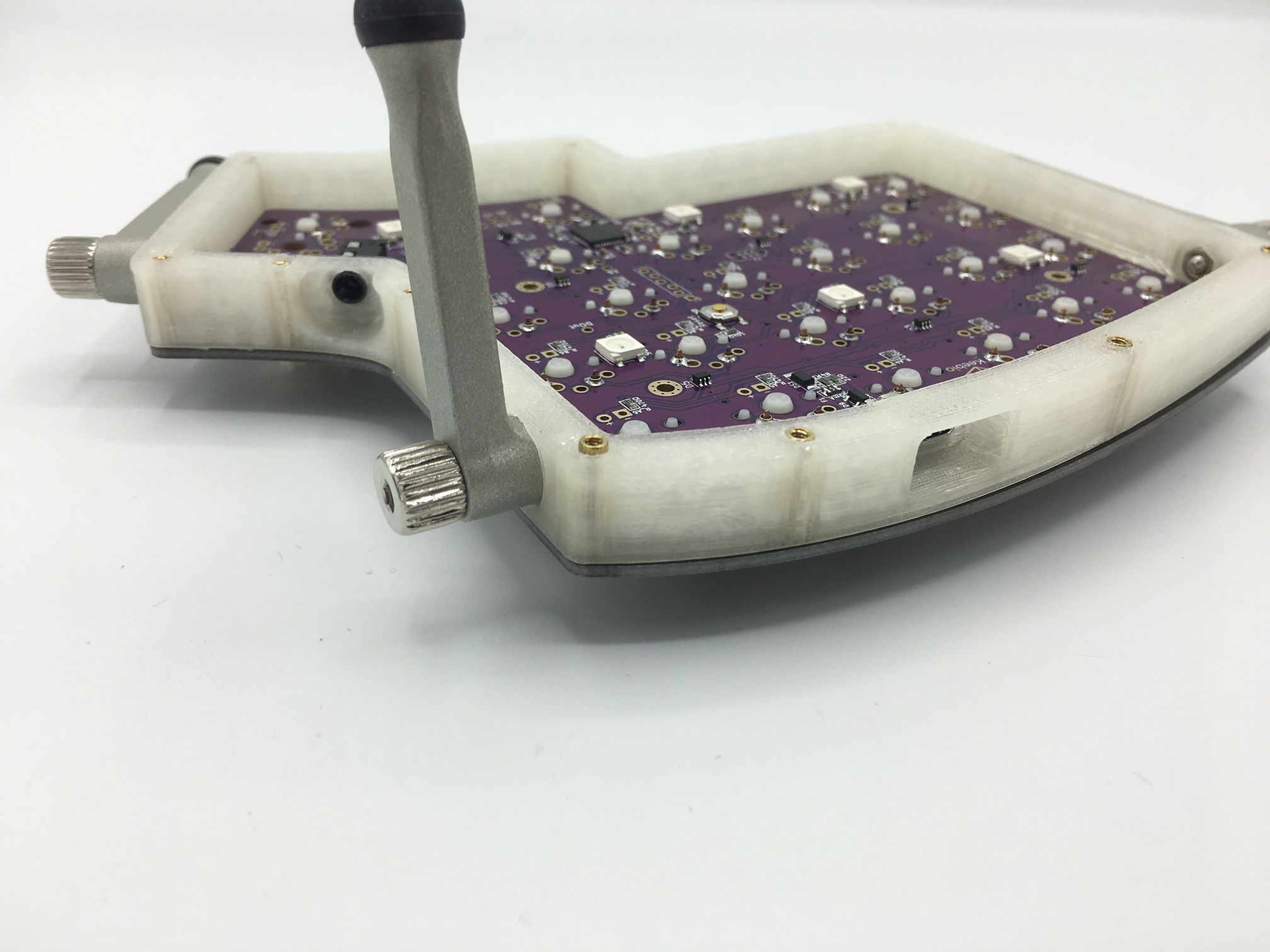 With the nuts inserted, you can now cinch down the Ergodox EZ pieces into the outer sides of the Iris middle layer.