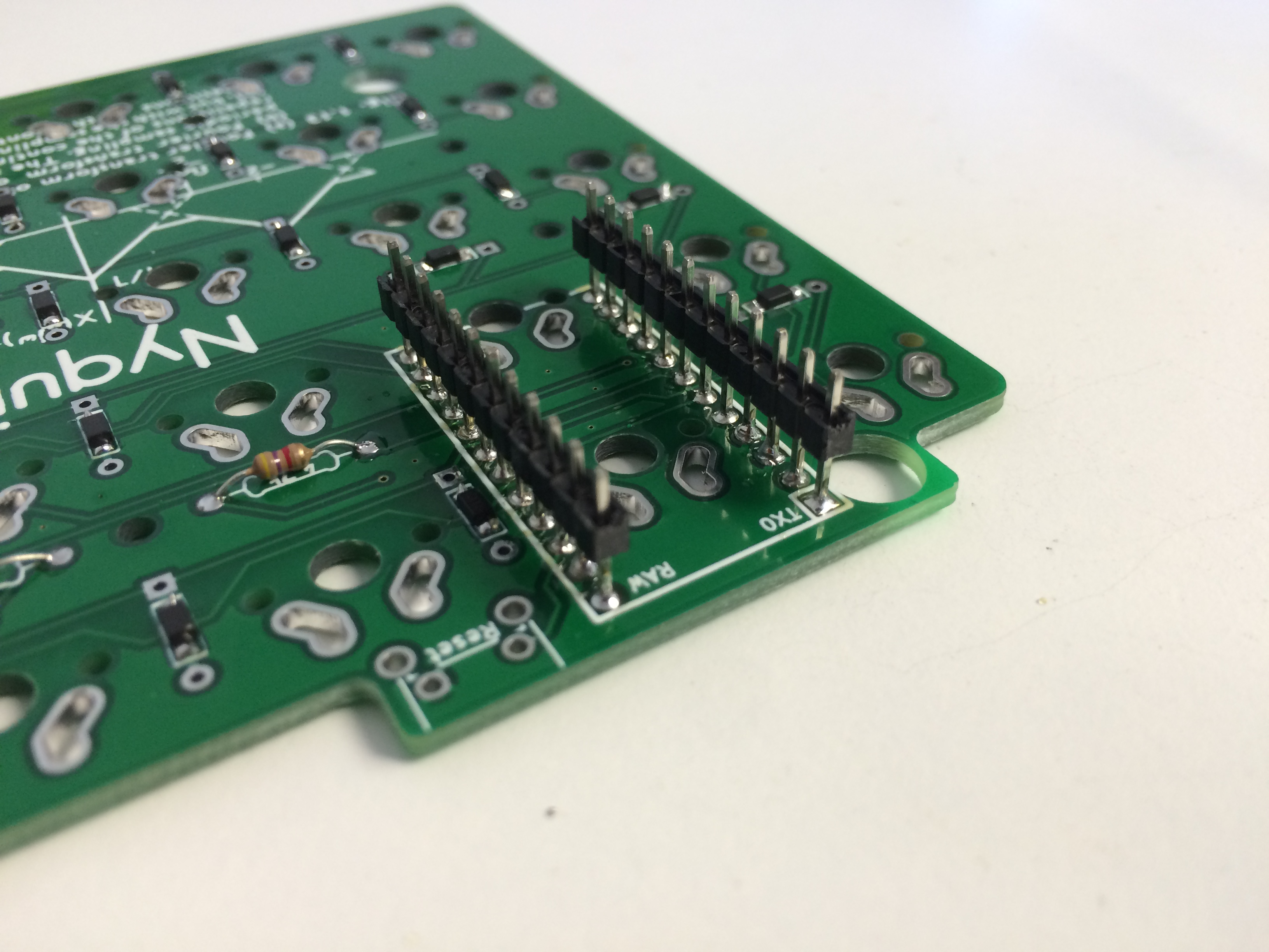 Solder in the Pro Micro header pins. The header pins are flipped upside down here to make removing the plastic a lot easier: