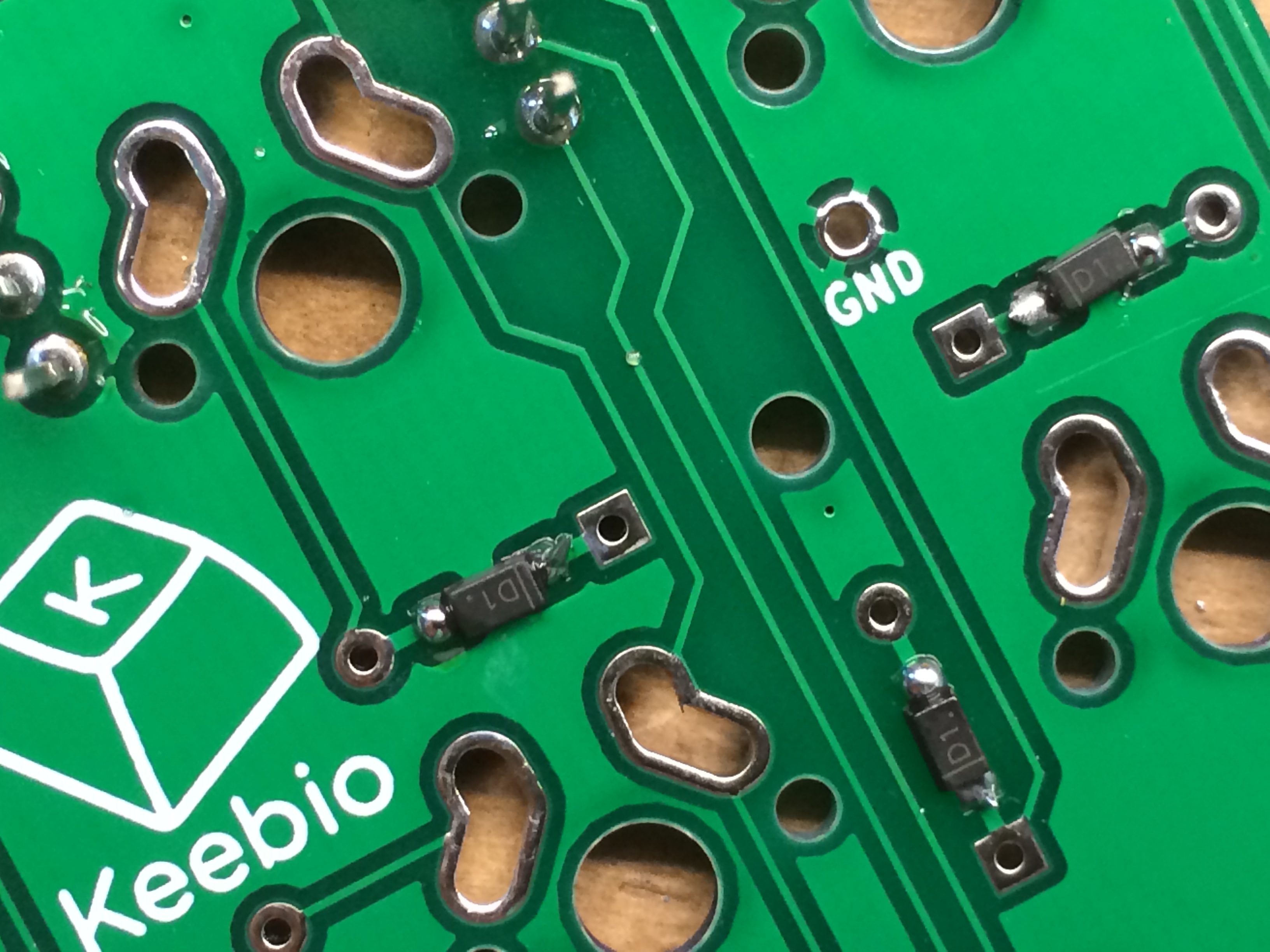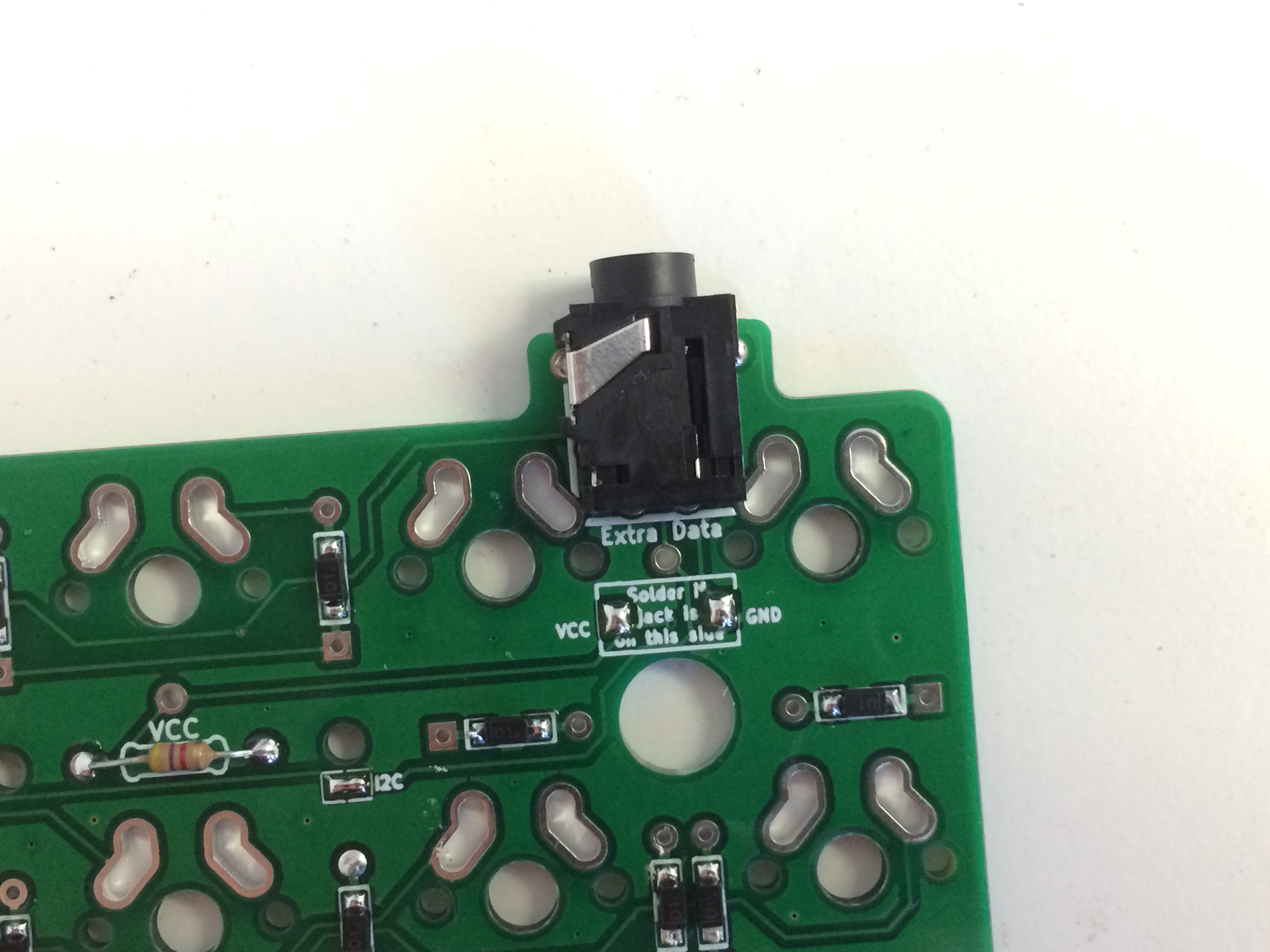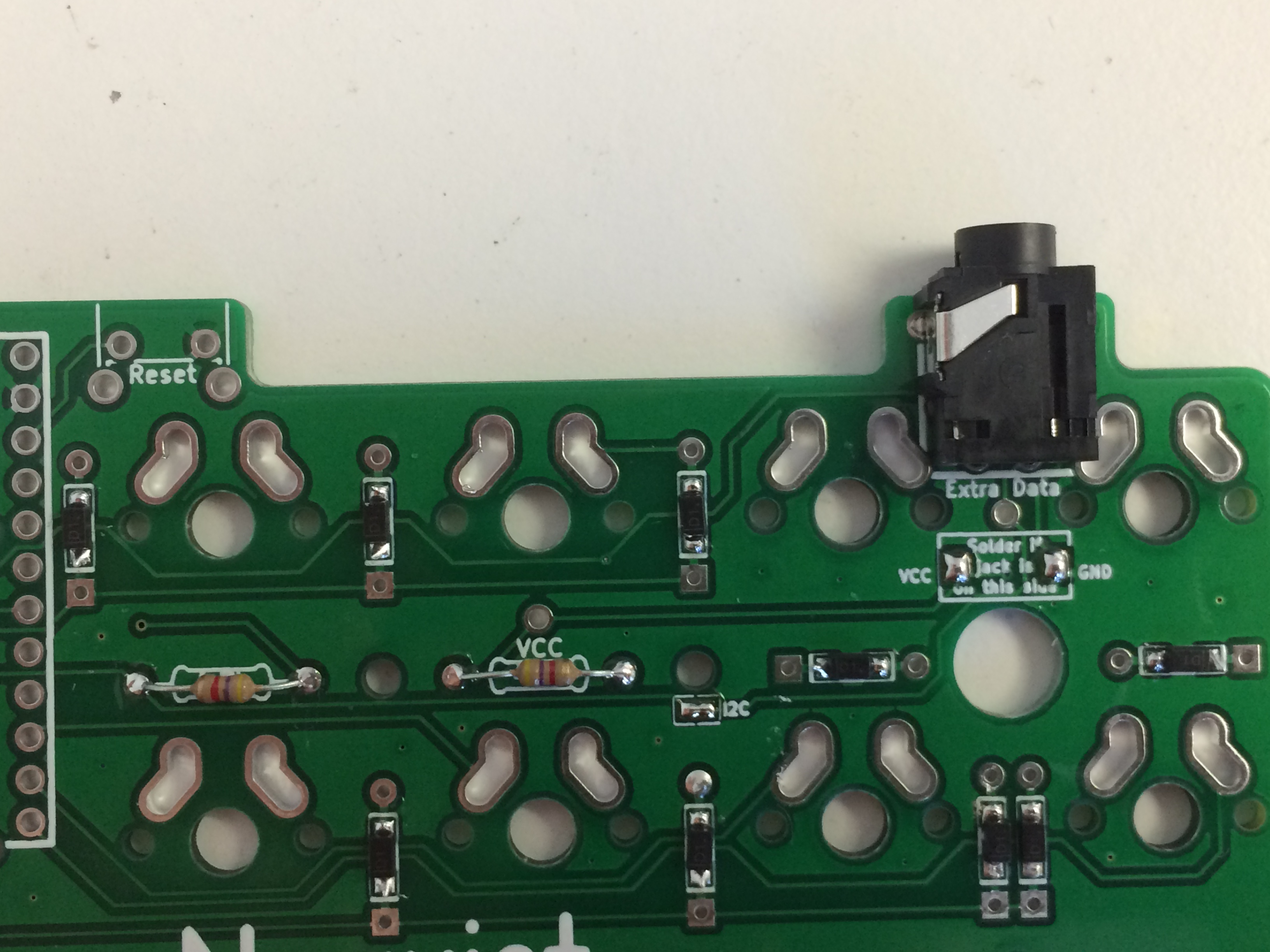 Solder on the TRRS jack, diodes, and resistors (optional). The resistors for I2C only need to be soldered on one half of the board: