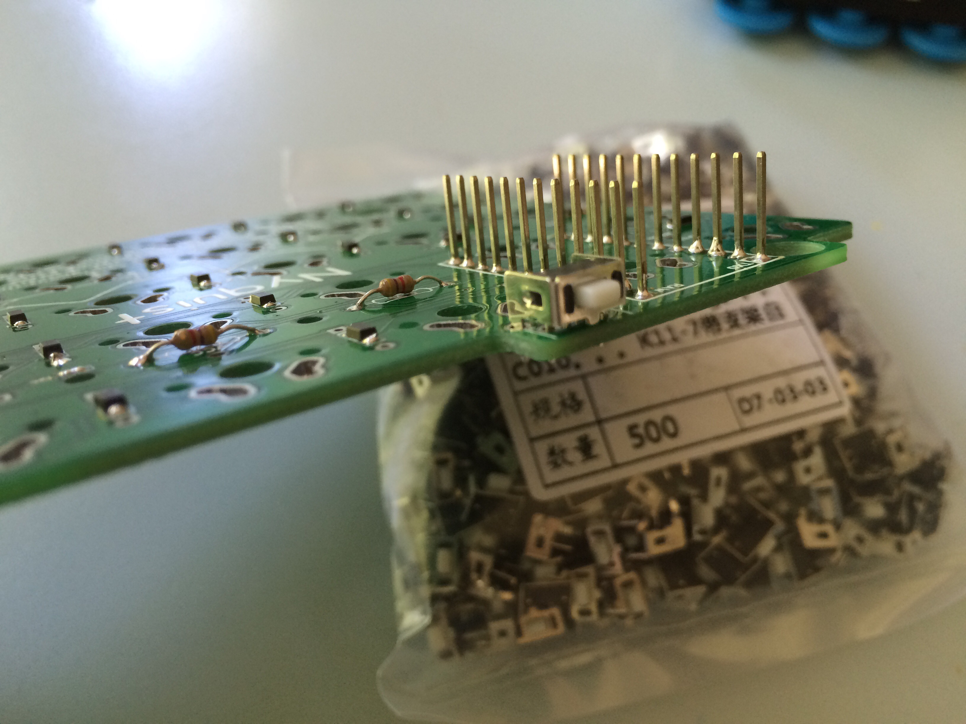 If using Alps switches, you will need to modify the two switches that will sit on top of the Pro Micro, since the width of the switch will touch the header pins of the Pro Micro.To modify the switches, you will have to shave off about 1-2mm on each side of the switch. (TODO: add picture here).
