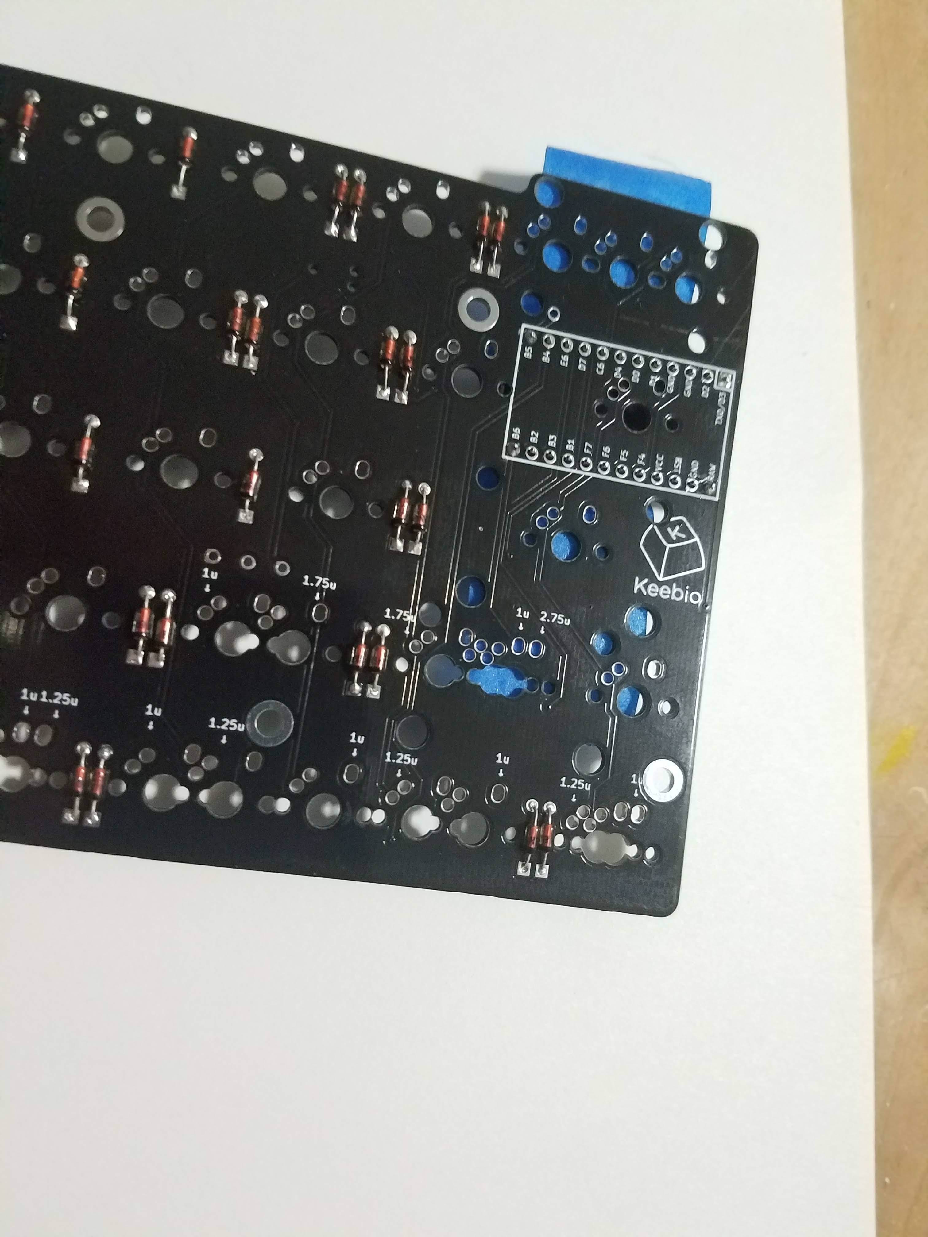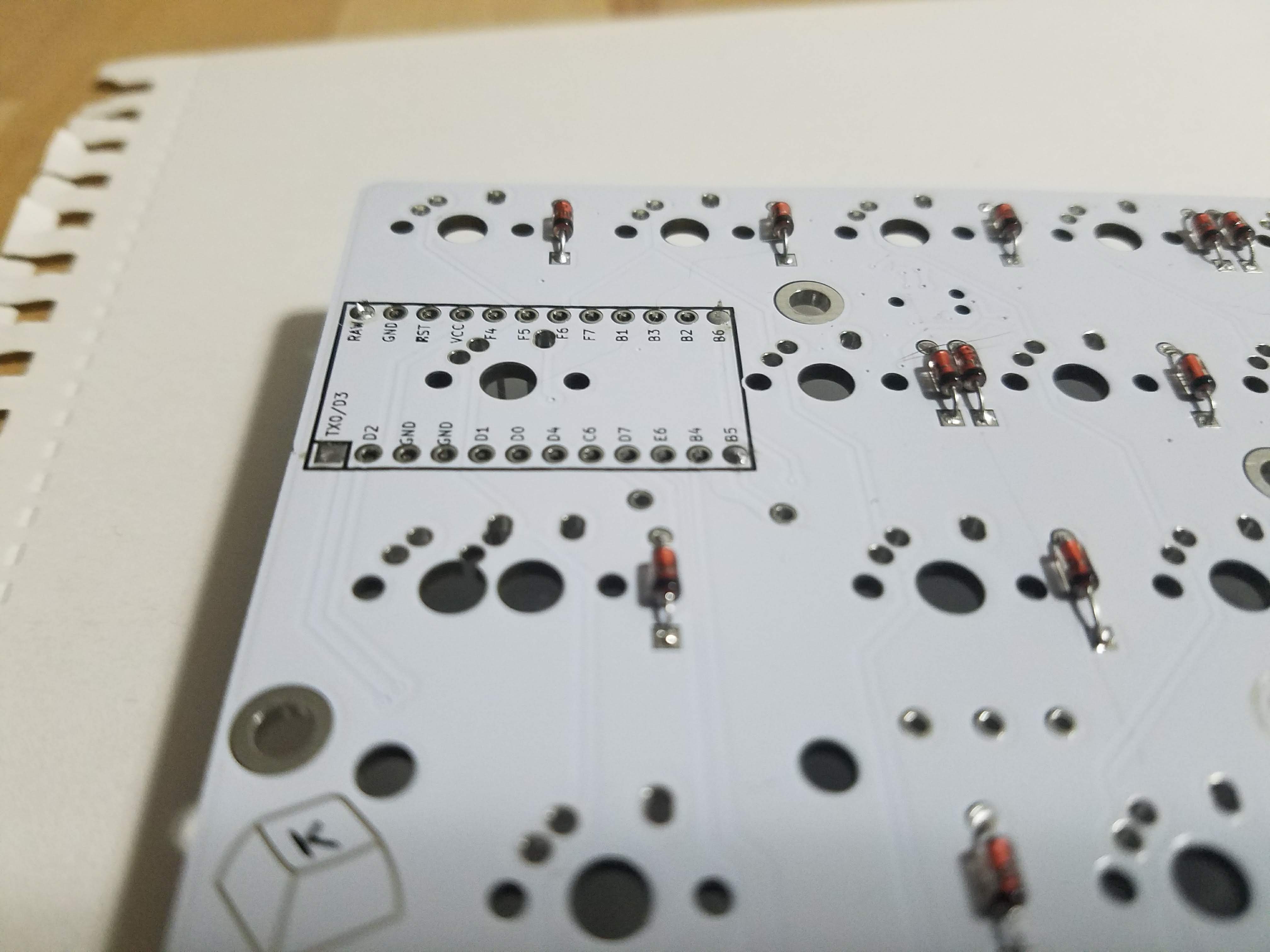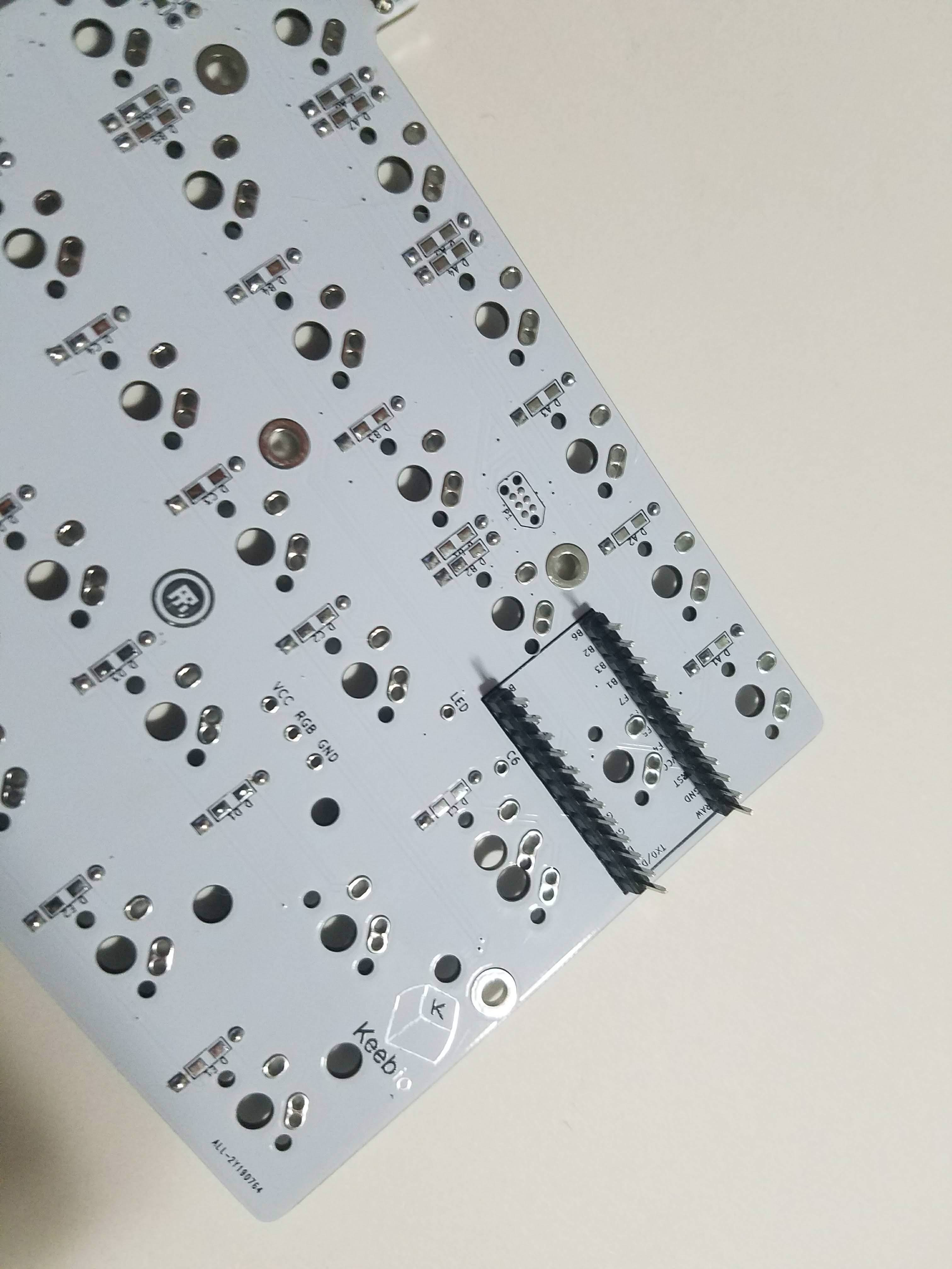 Place the Pro Micro on the header pins. Match the PM pinouts to the pinouts on the PCB.