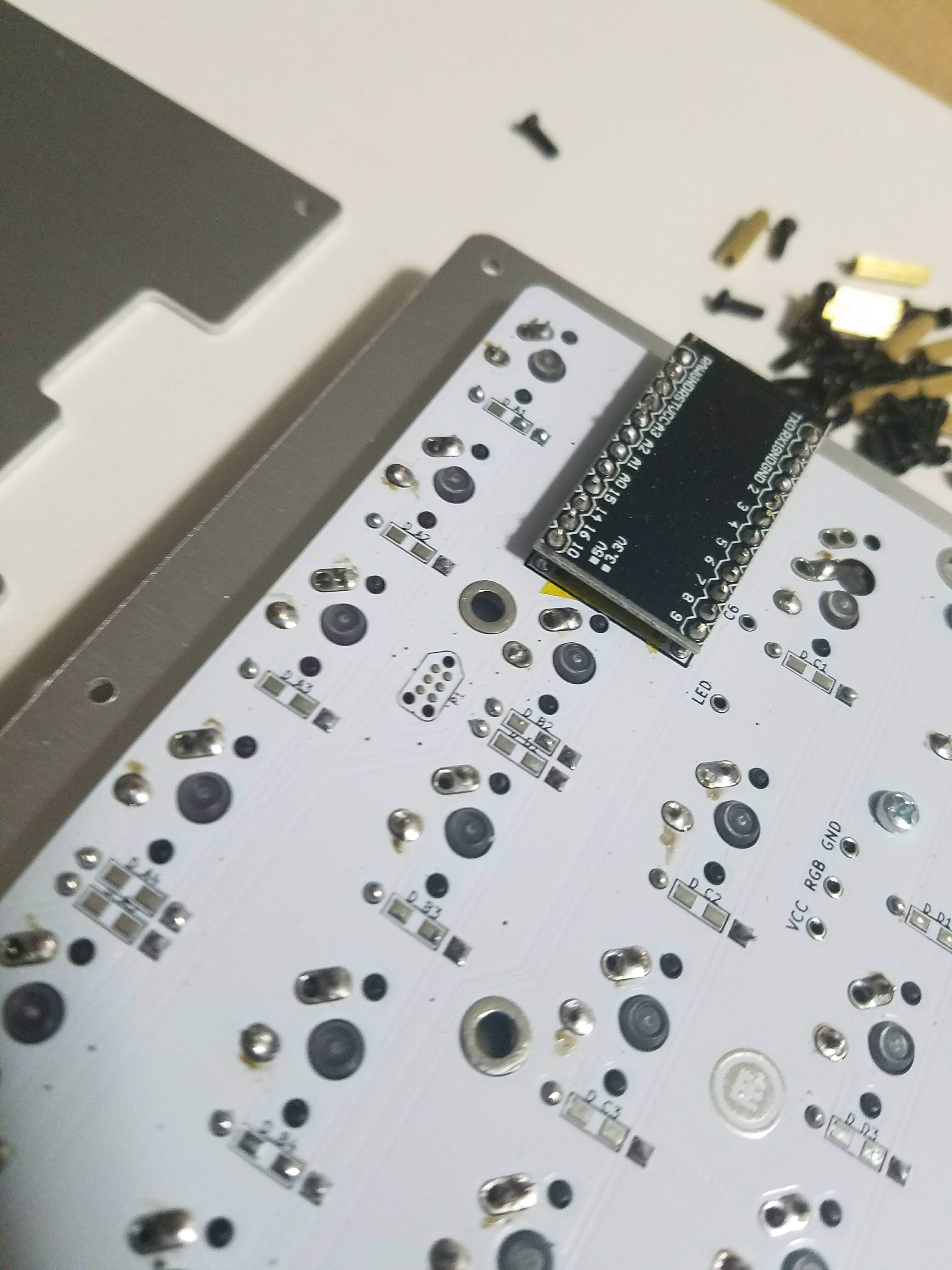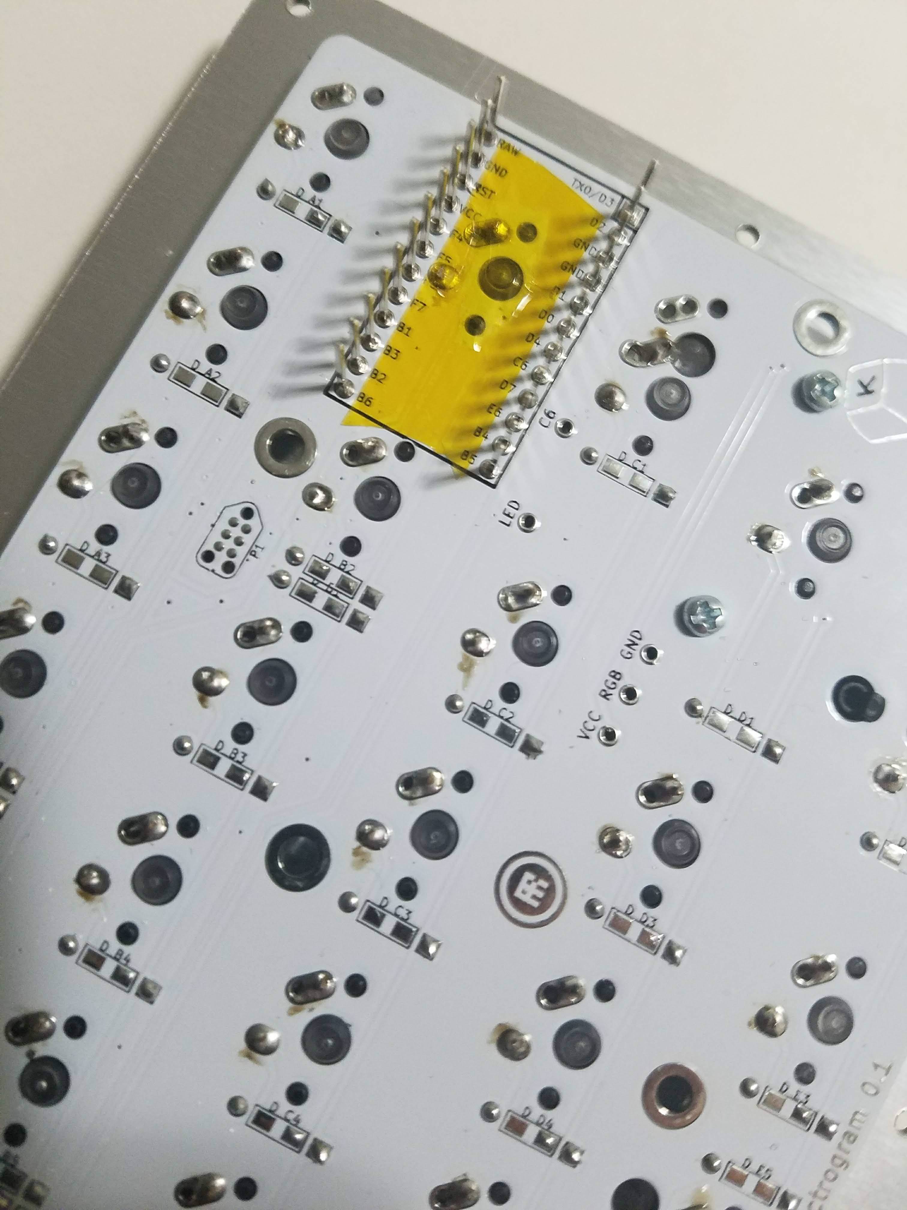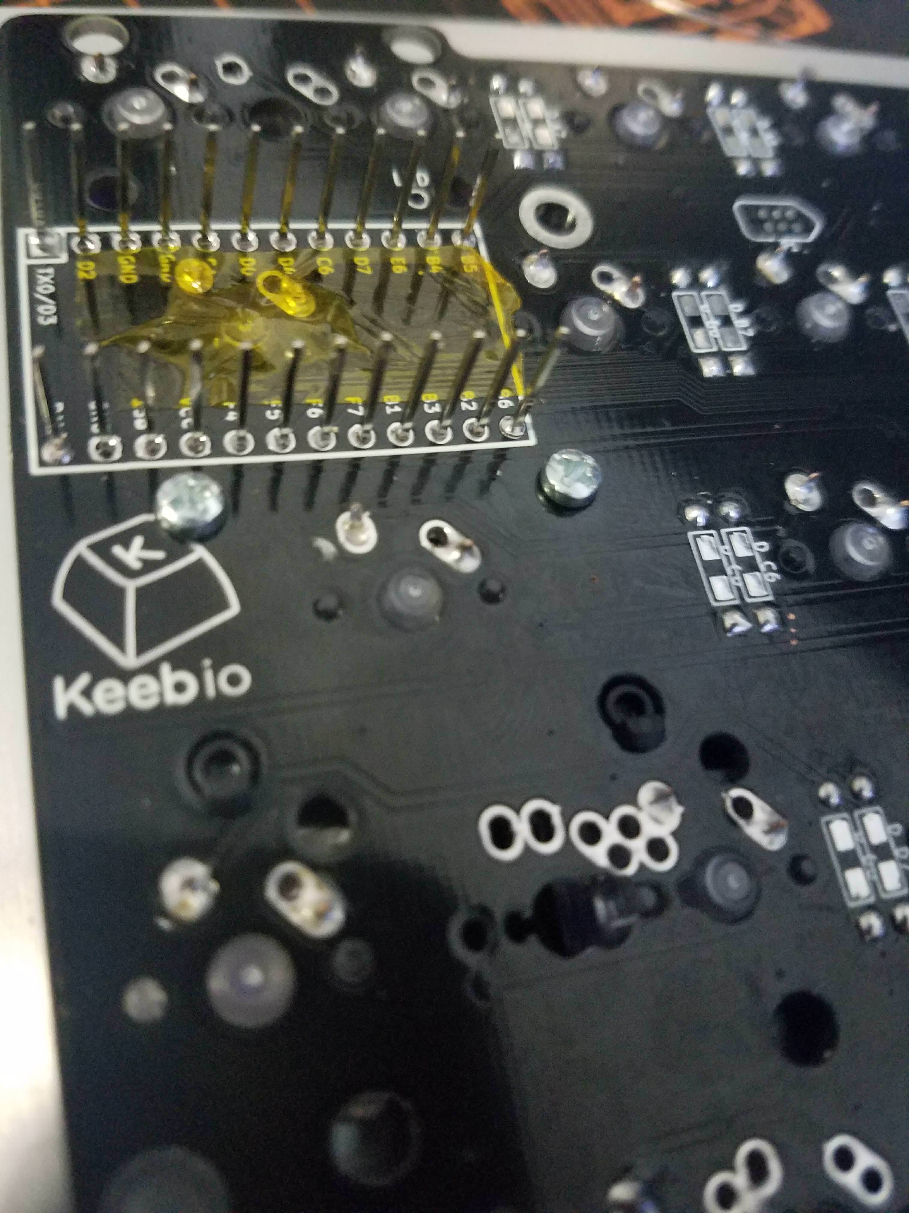 Place the Pro Micro on the header pins. Match the PM pinouts to the pinouts on the PCB.