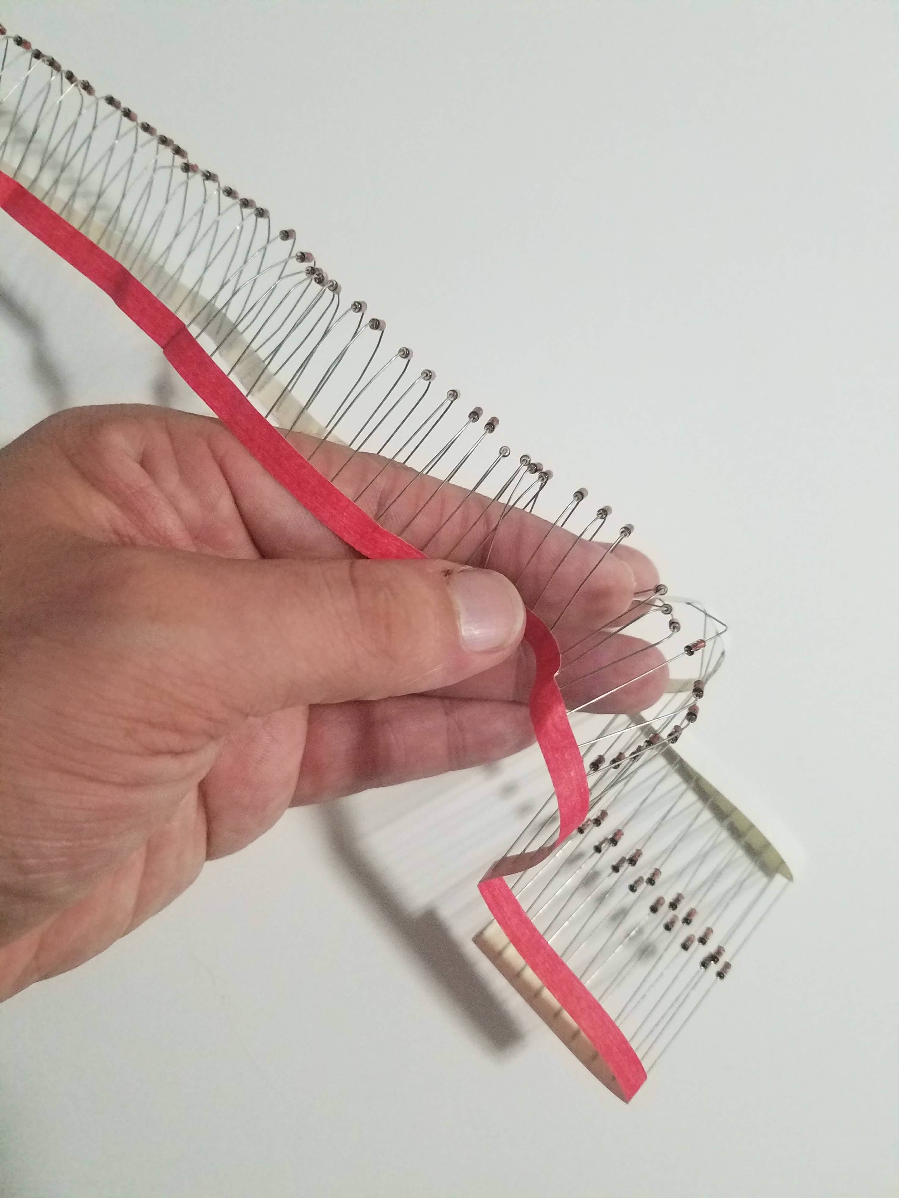 If you're using through hole diodes, bend 'em up. Here, I'm just bending it around my finger. Then tear the paper off carefully as not to bend them.