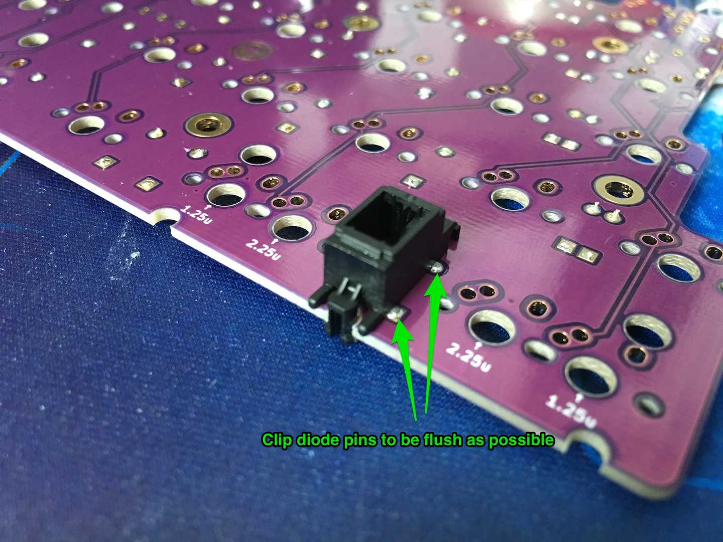 For the Rev. 1.0 left PCB, one of the stabilizer mounts sits right next to a diode. If using through-hole diodes, make sure that the diode legs for spot shown below are clipped as flush as possible, so that the stabilizer can clip in correctly.