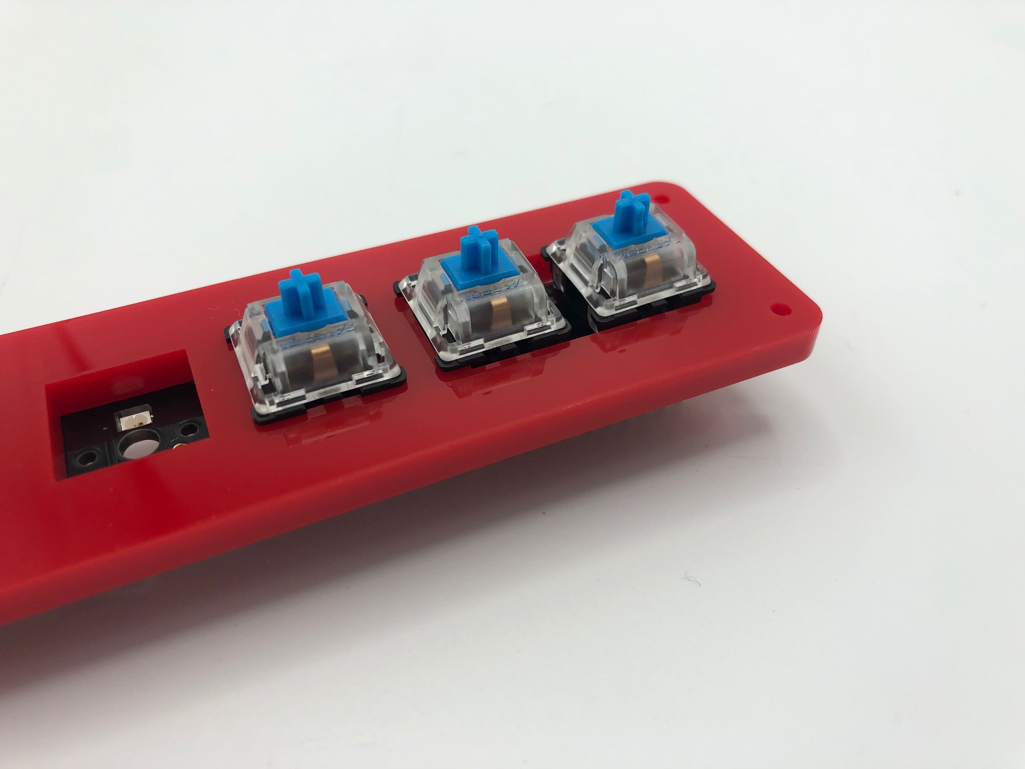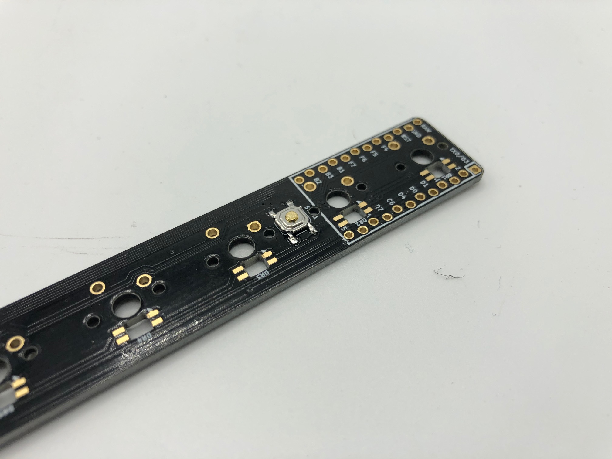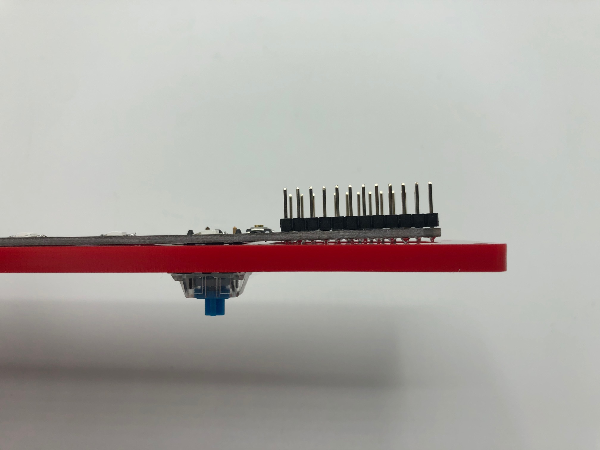 If you used Method 2 of soldering the header pins, you'll see that the portions of the header pins will stick out a bit a hit the underside of the switch plate. This will be okay, but it just makes soldering on the two switches there a bit more difficult.