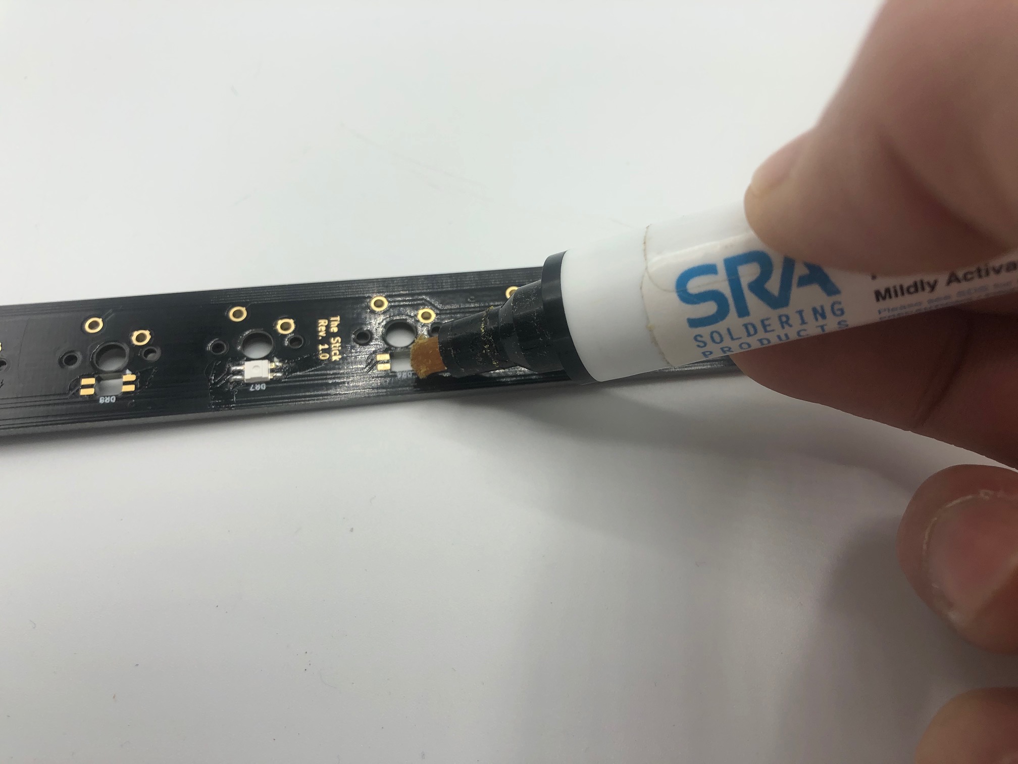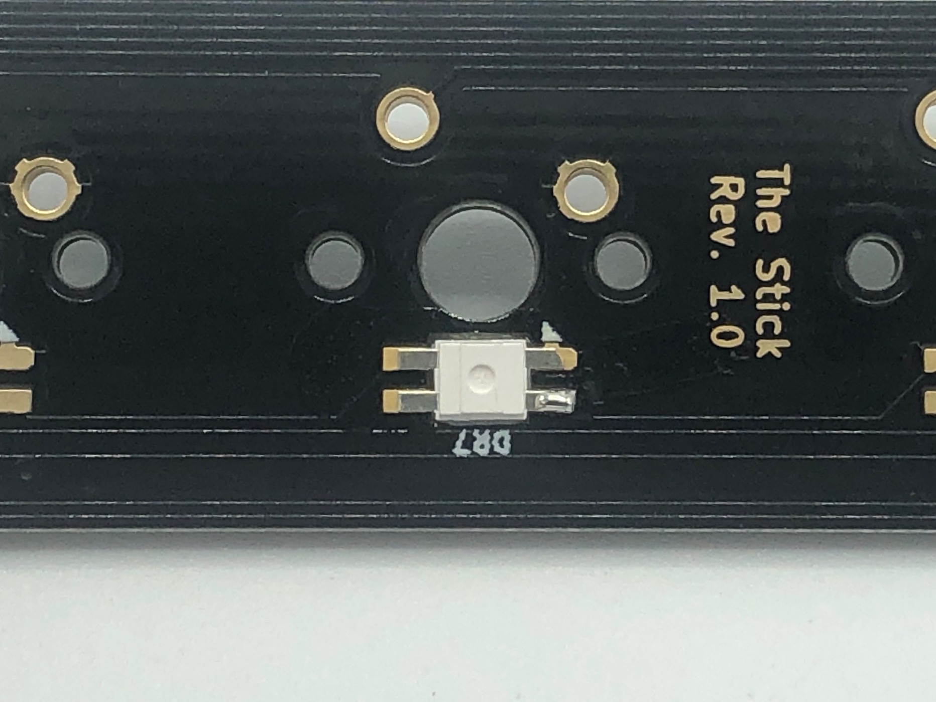 Once you're happy with the first leg of the LED, solder the other three legs. The pad next to the white triangle may need a bit more time for the solder to flow to it than the others.