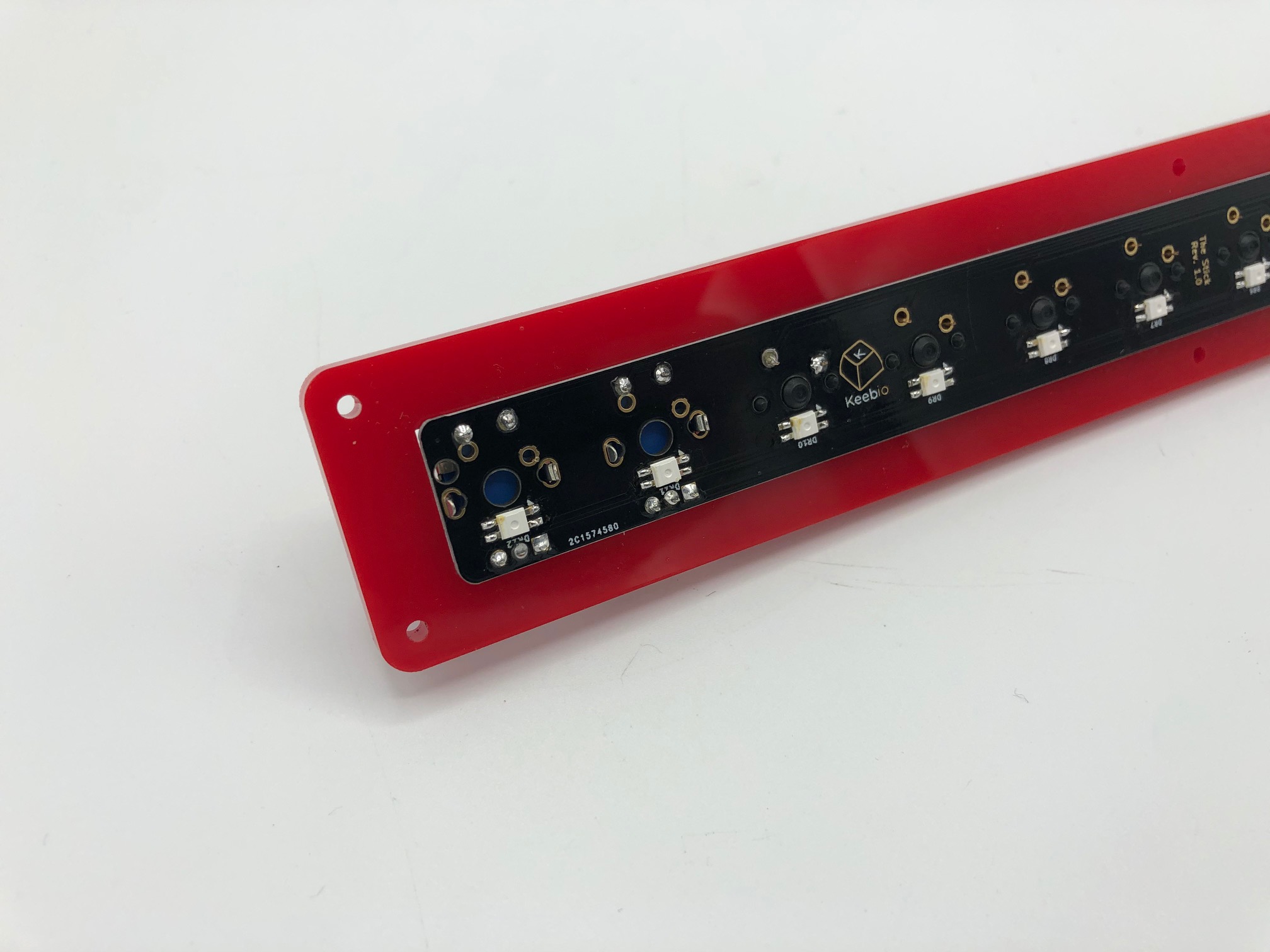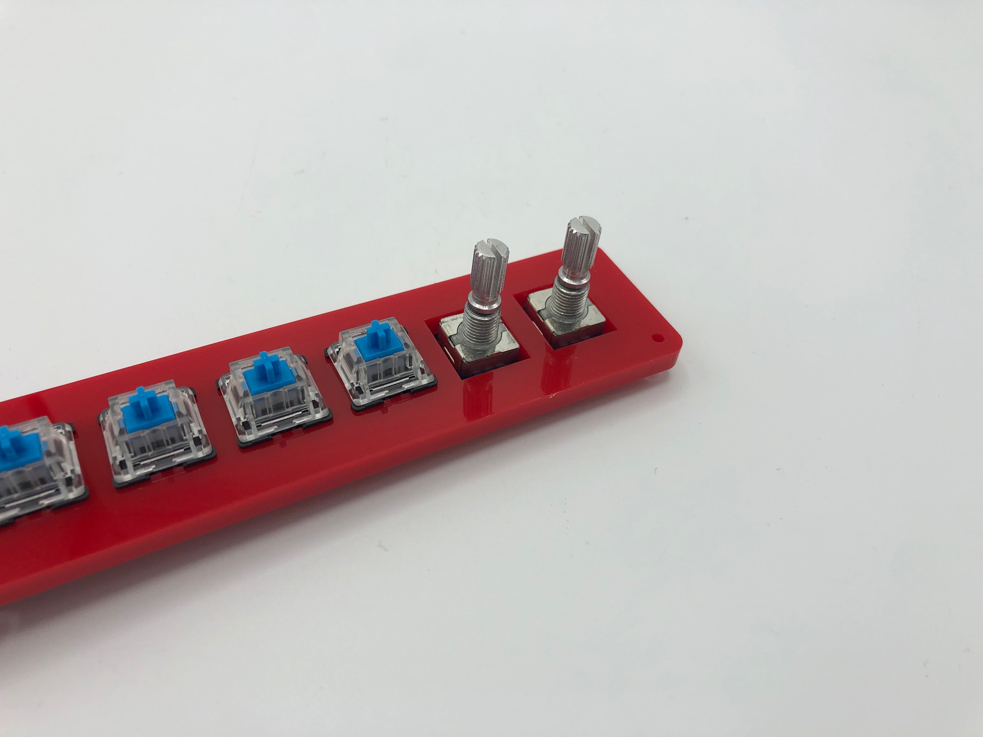 The orientation of the switch plate is important if you are going to be installing rotary encoders! In order for the encoders to not come in contact with the plate, make sure encoder cutouts are aligned as shown below. The encoder cutout is larger than the switch cutout at the top by 1mm and larger at the bottom by 1.5mm. If you are not careful, then the 3 bottom encoder pins may come in contact with the plate and be harder to install.