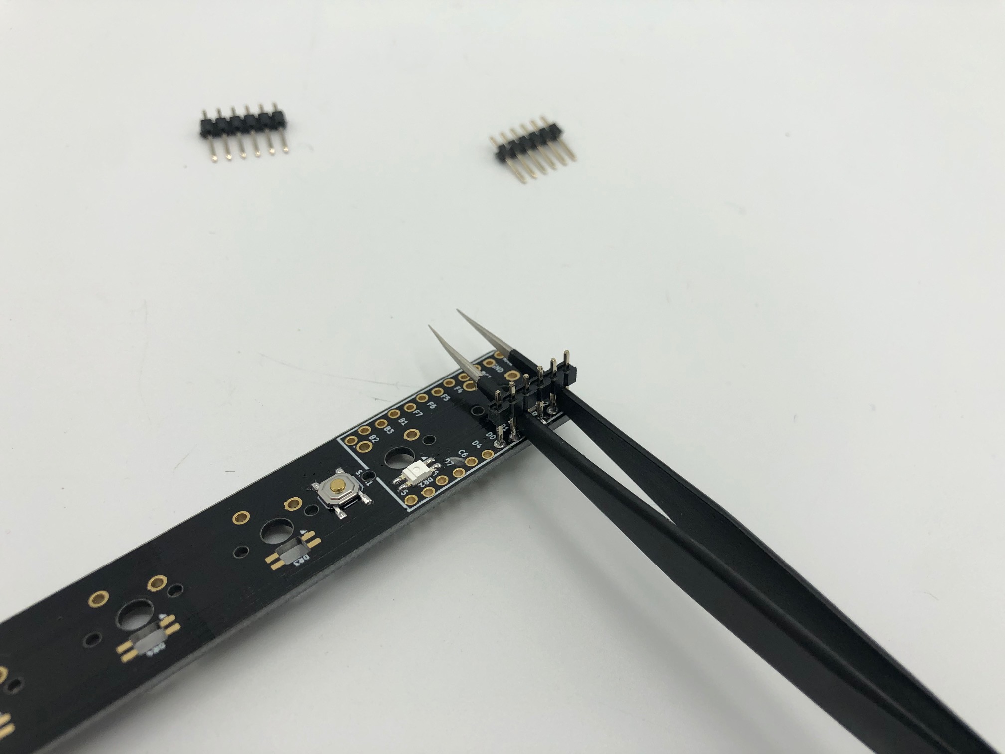There's two ways to add the header pins to the PCB. One is the traditional way of having the plastic of the header pins up against the PCB. The other way is to insert them in upside down, solder them in, and then remove the plastic.
