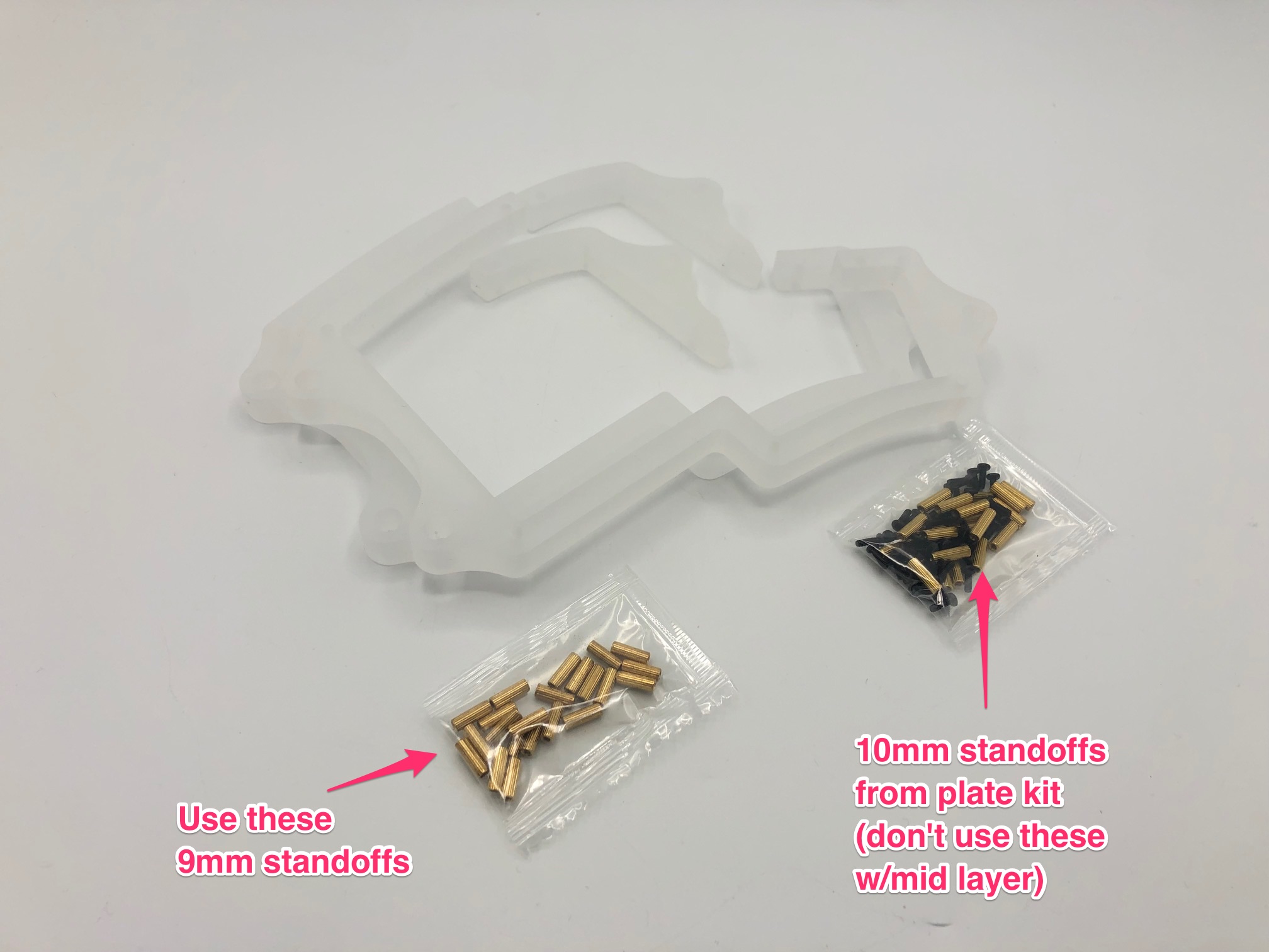 Make sure that you use the short standoffs that are included with the middle layer kit. Normally, the plate kits will include 10mm standoffs. However, the acrylic middle layers are about 9.5mm thick, so if you use the longer standoffs from the plate kit, the middle layer will rattle. So, 9mm standoffs are included in the middle layer kit, which will prevent the pieces from shifting around.