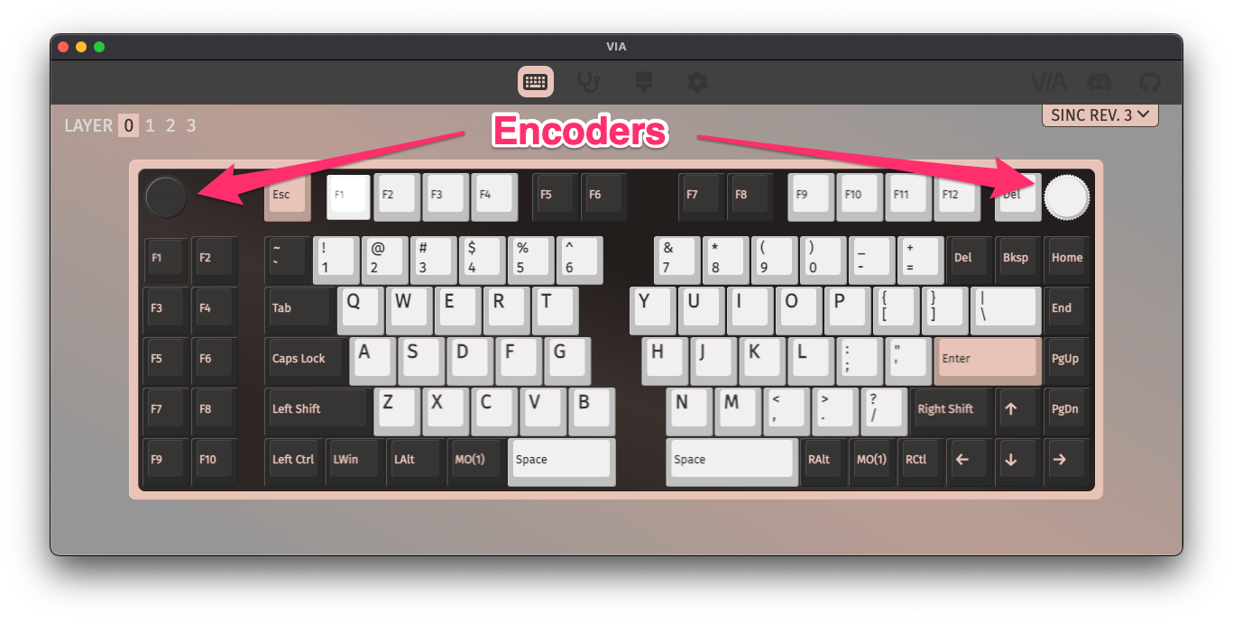 New in Version 3 of VIA is the ability to reprogram encoders. Note however, that the firmware and VIA keyboard definition JSON must be set up to allow for the encoders to be remapped using VIA.