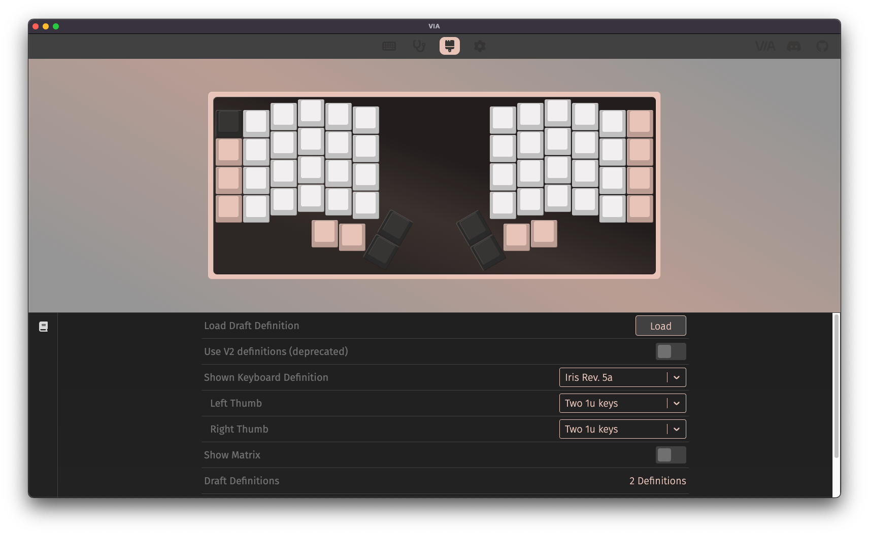 Sometimes, some not so great keyboard vendors don't work with the VIA team on getting their definition files added to the app, so they'll make you download definition files and manually load them here. Another reason could be that preliminary VIA support has been added to a board for testing, and the designer is awaiting for QMK and/or VIA to merge in the PR for it.